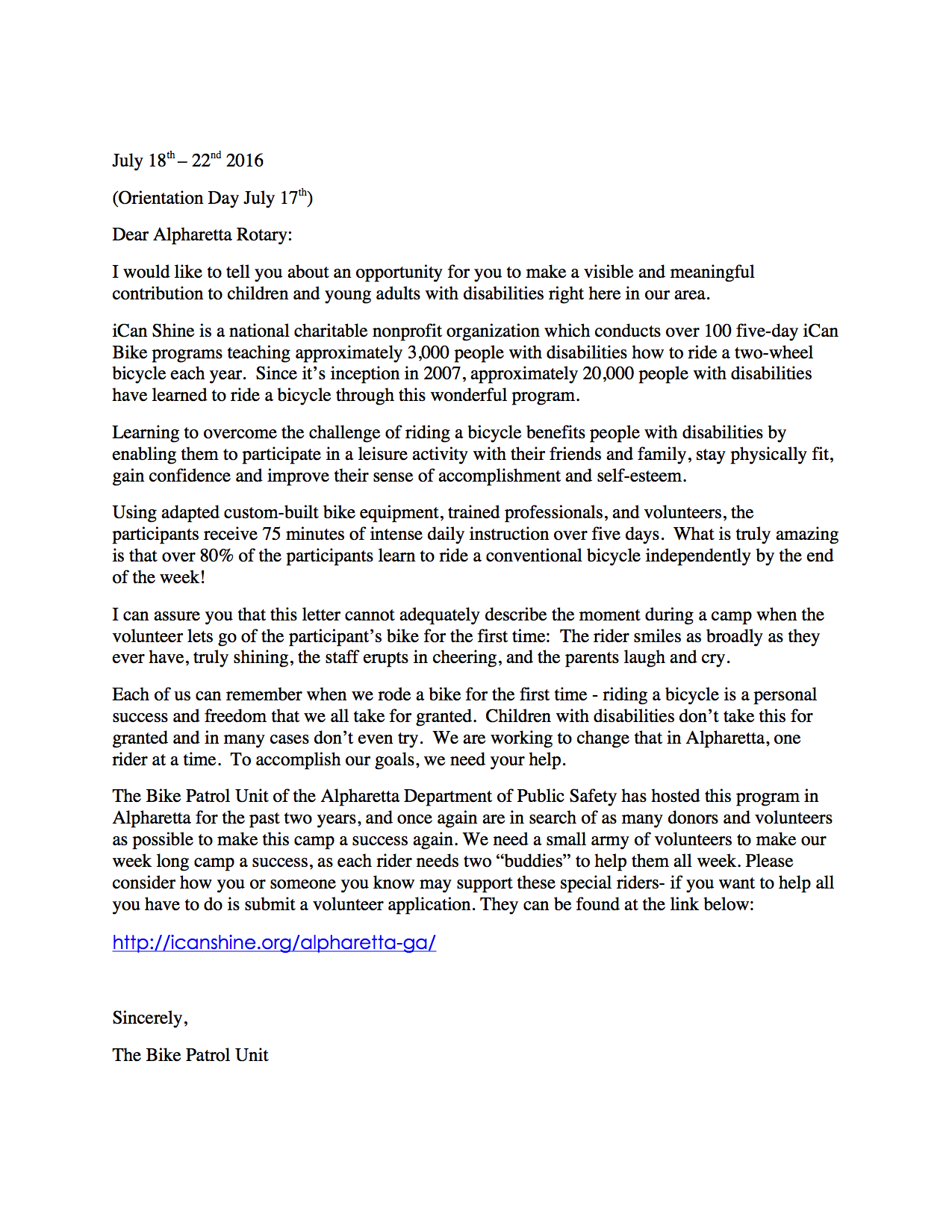 The Alpharetta Rotary Club donated funds and volunteers to the iCan Bike Alpharetta event. This event is organized by Officers Amanda Clay and Allen Elfreth with the Alpharetta Police Department. They were presented with the inaugural “Service Above Self” award given by Alpharetta Rotary because of their time and efforts dedicated to iCanBike.