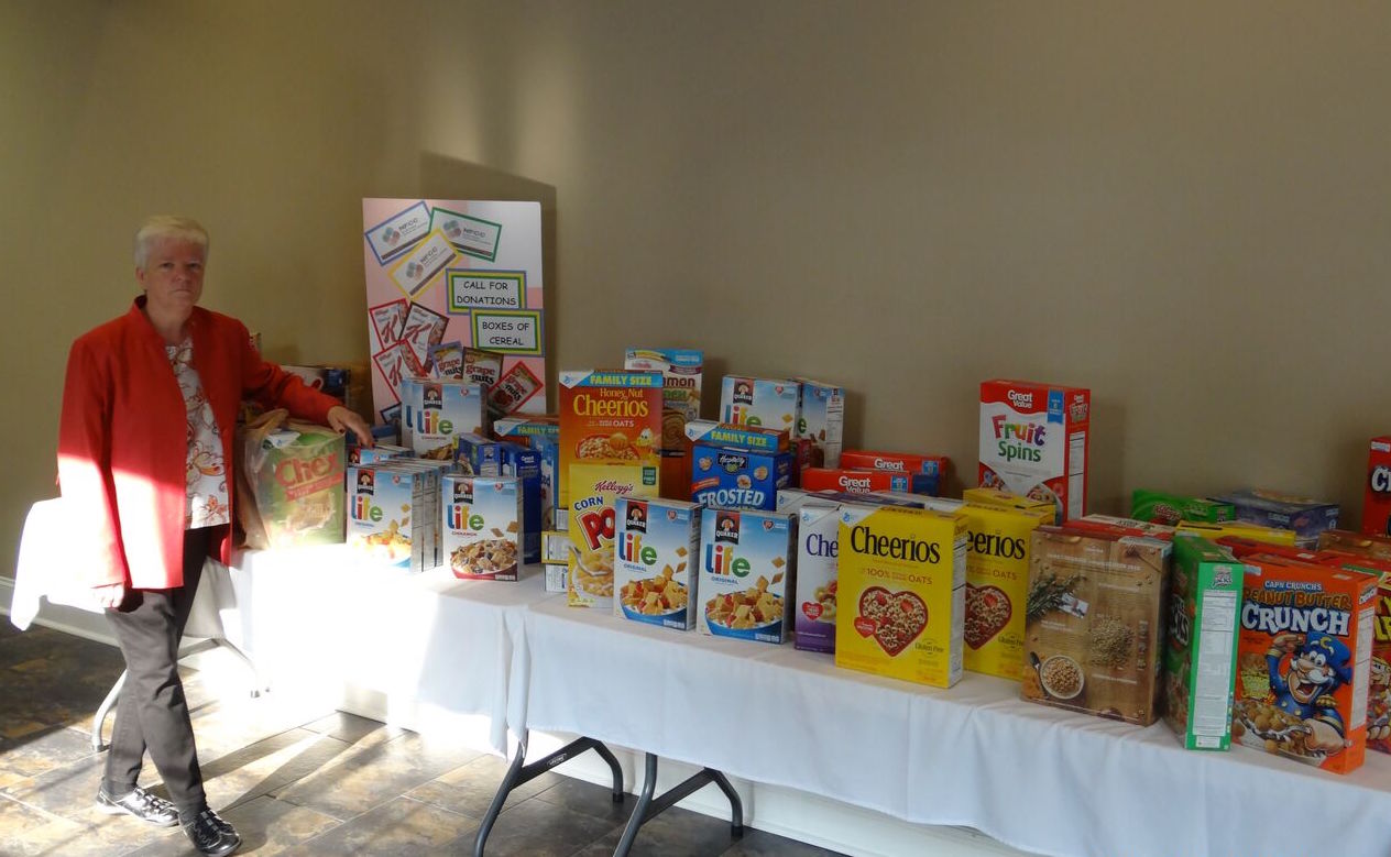Alpharetta Rotary collects Cereal and other pantry items for North Fulton Community Charities for the summer. Food needs increase during the summer because kids stay home during the summer. The club collected 169 Boxes.