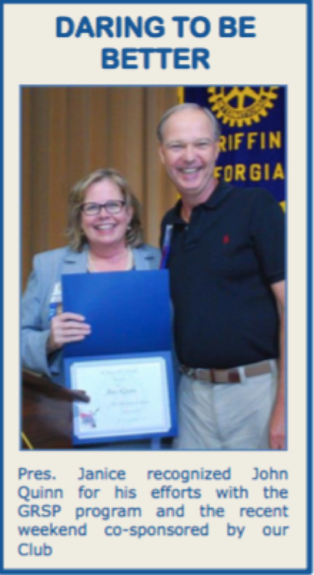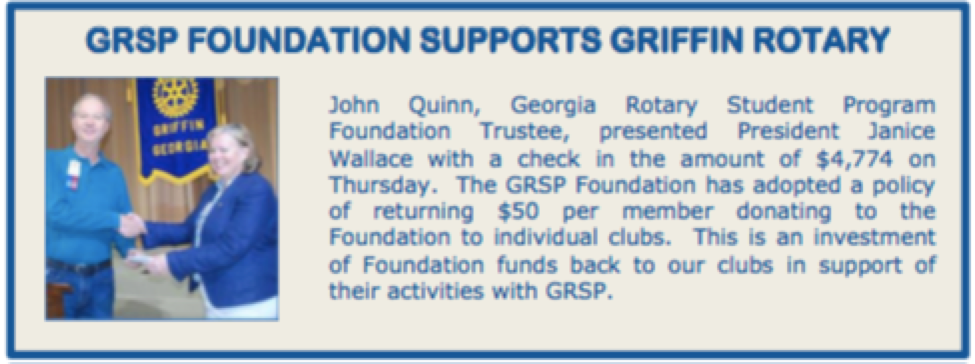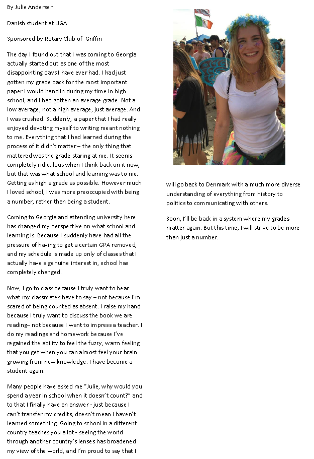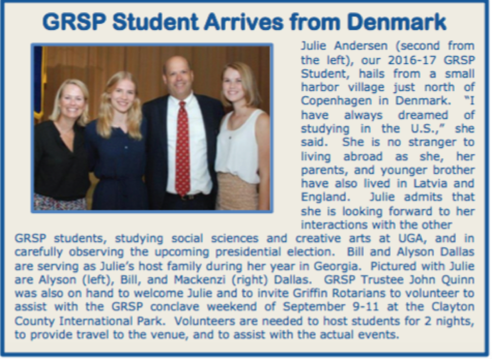 The Rotary Club of Griffin sponsored its first GRSP student in 1949 and every year since. This year's student, our 89th, is from a small harbor village just north of Copenhagen, Denmark. She is attending the University of Georgia and studying social studies and creative arts. Rotarian Bill Dallas and his wife Alyson, are hosting for the year.