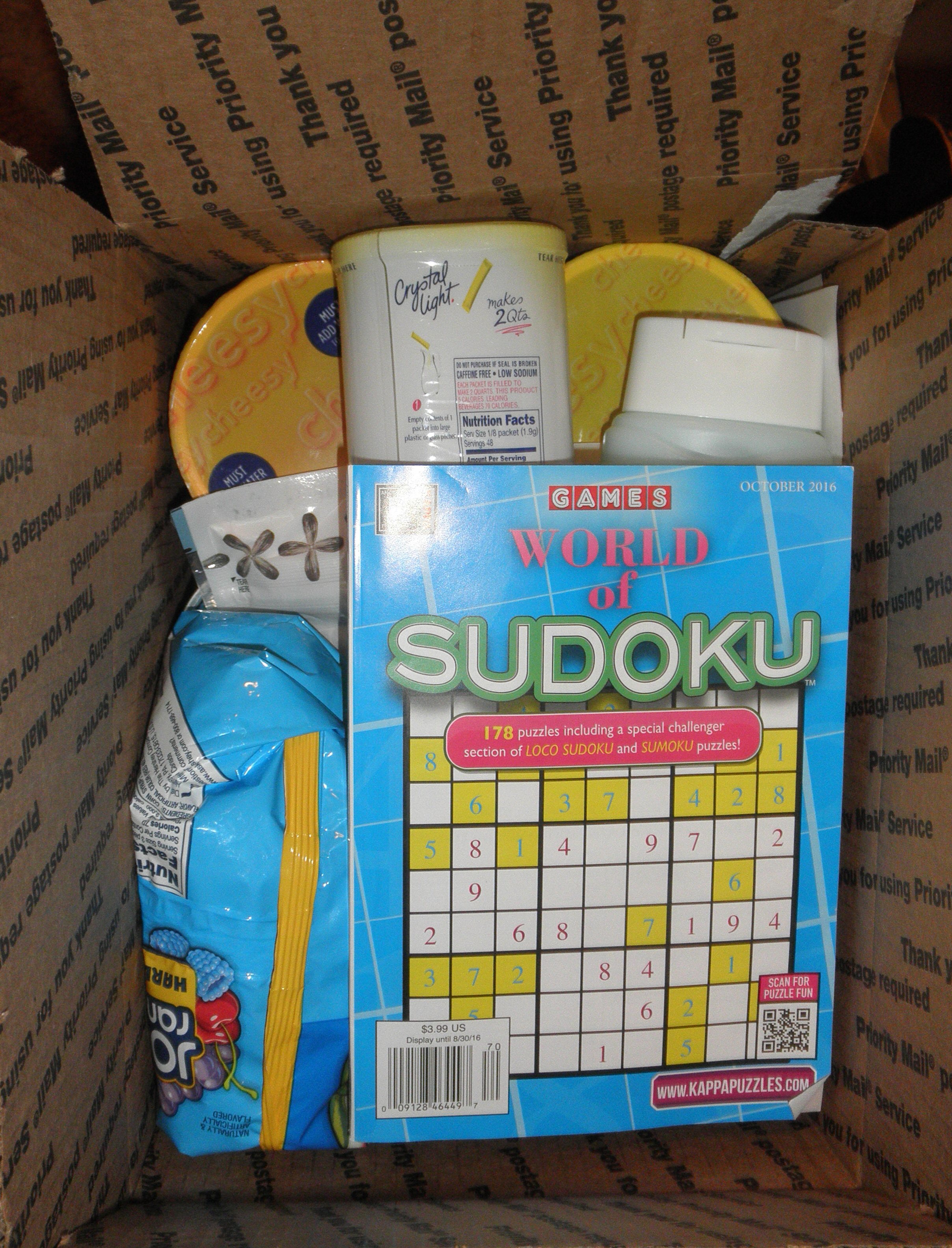 Each month a box of goodies is shipped. It includes snacks, books, games, toiletries, cards and letters