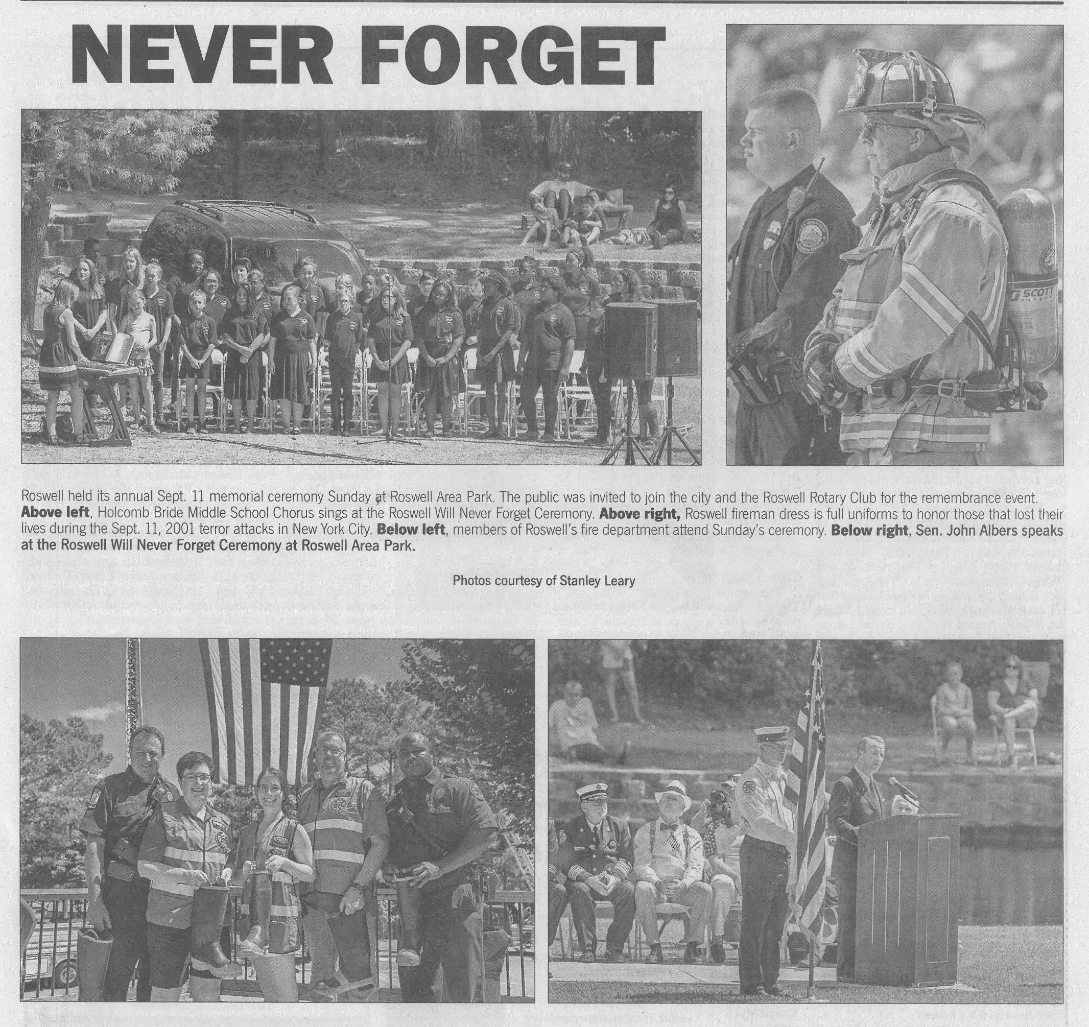 This year's ceremony could not have been better. Great weather, folks came by after church and the lake was lined with an estimated 500 Roswell citizens that want to remember the sacrifices by our first responders and pass to the next generation the impact that this event had on our country.