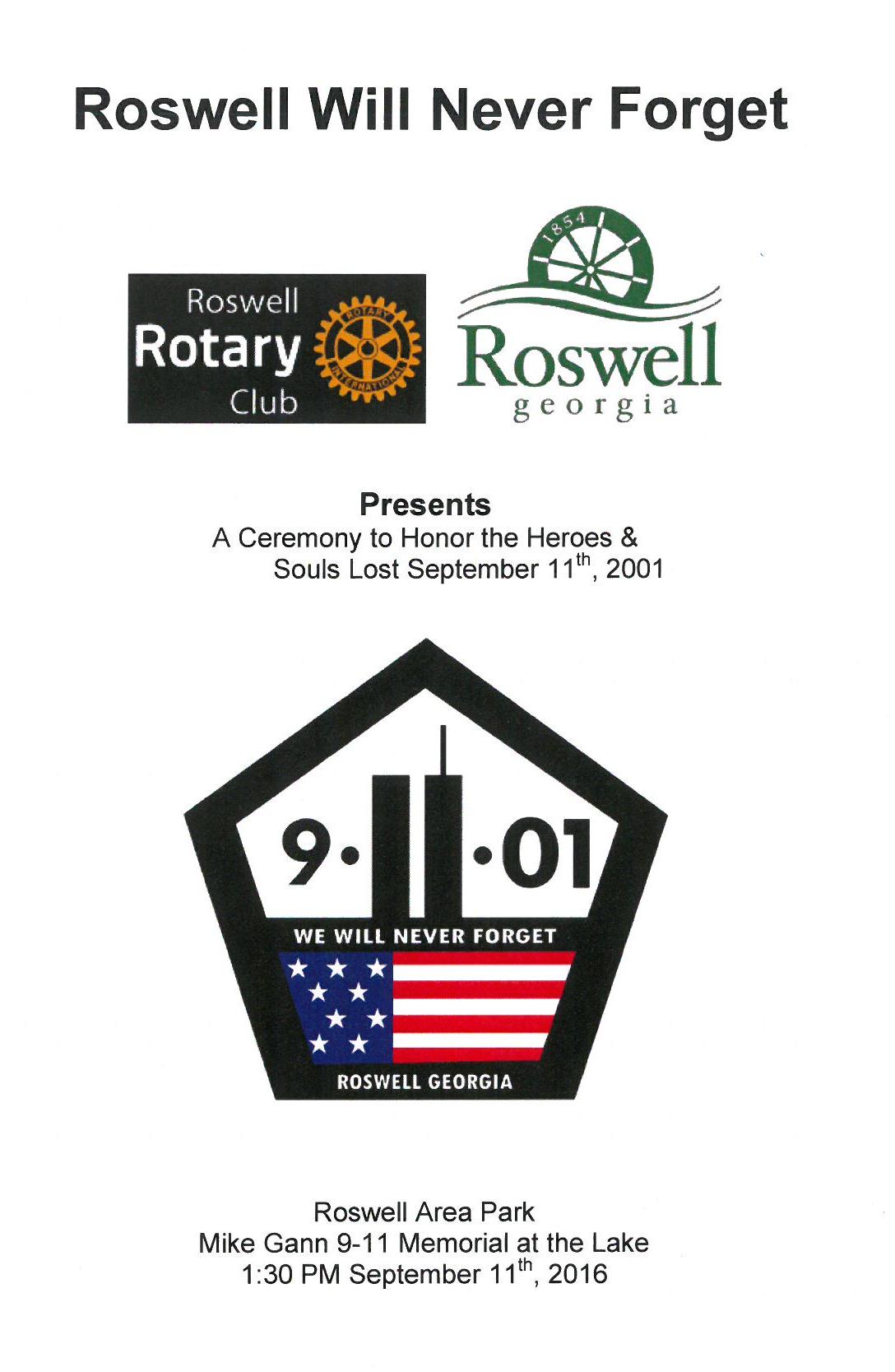 The Program: The 9/11 Tribute Program was done on a Sunday this year at the Mike Gann Lake in Roswell Area Park. A Committee of 23 meet monthly until 2 months before the event then committee meets weekly.