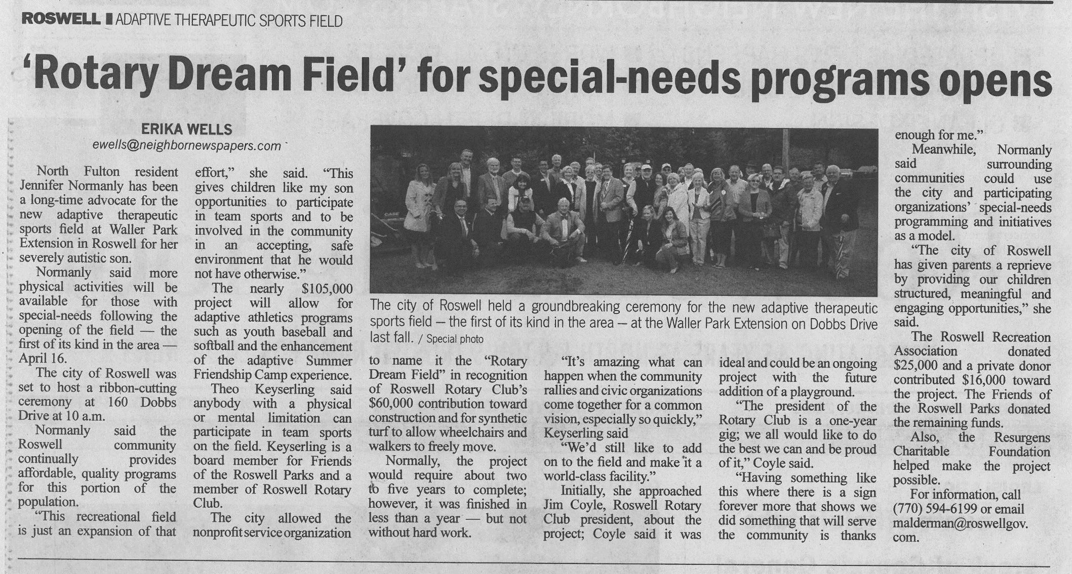 This Adaptive Needs Ball Field and Playground is a signature project for RRC. It addresses an under served segment of our youth population wishing to participate in sports and enjoy the socialization that comes from being part of a team. This field makes that possible; providing a surface designed for wheelchairs, and it fulfills both the community and youth avenues of service Our partners are the City's Parks and Rec Dept., and a strong community of parents who are thrilled that Roswell will be supporting these special kids. We completed our first game!