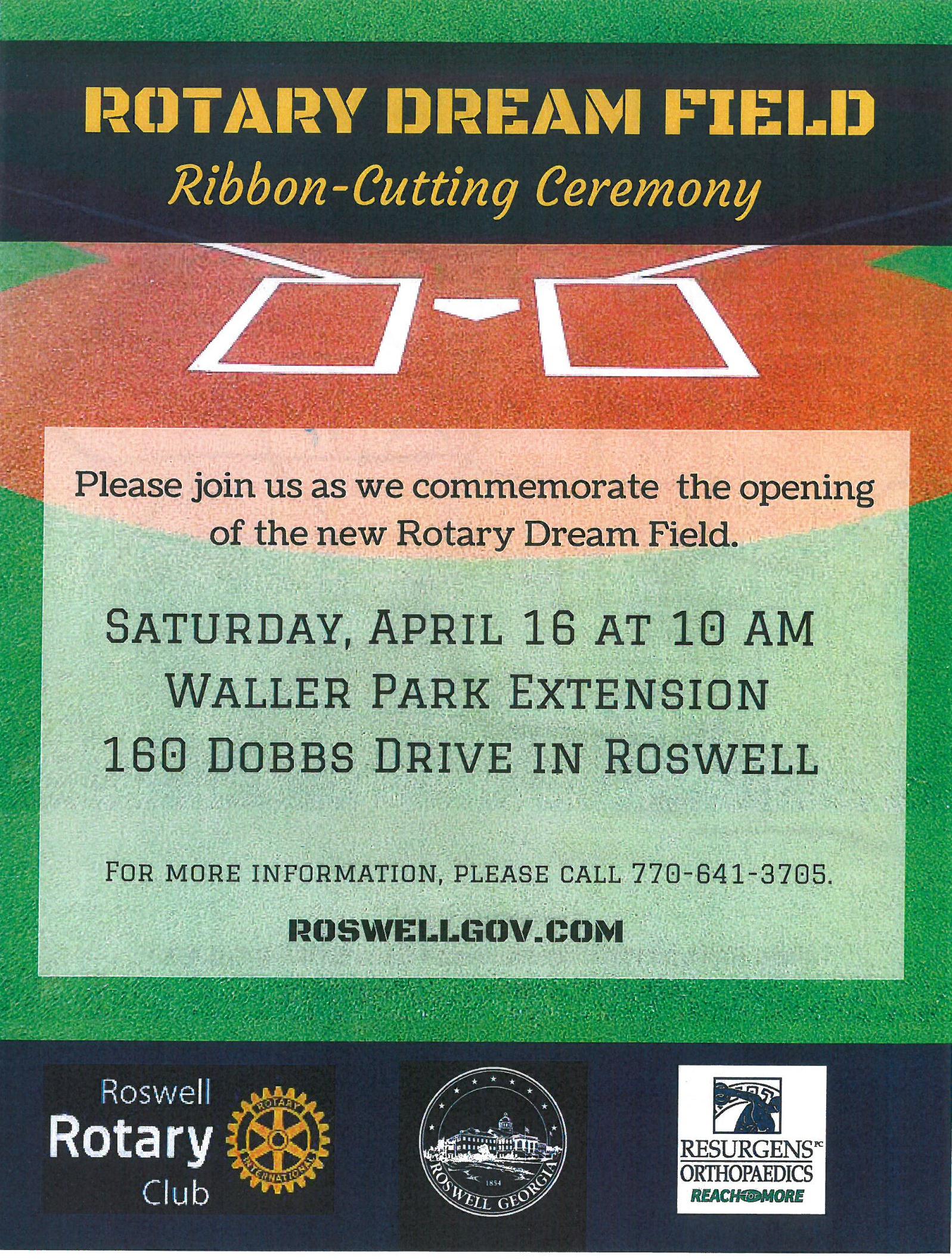 This quarter, we welcomed the first season of kids actually playing on the Roswell Rotary Dream Field that now carries over from last year. Several of our members remain involved in the management and launch of this project. And the scoreboard is a permanent reminder of this work in the community by our club.