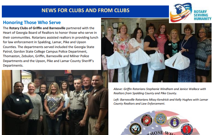 The Rotary Club of Griffin sponsored the Heart of Georgia Board of Realtors' public safety recognition lunch on August 24, 2016. The realtors organized the event which consisted of delivering lunch to the Griffin Police Department, Spalding County Sheriff's Department, Georgia State Patrol office in Griffin, Pike County Sheriff's Department, Zebulon Police Department, Lamar County Sheriff's Department, Burnsville Police Department, Upson County Sheriff's Department, Thomaston Police Department and the State Patrol office in Upson County. Rotarians from the Griffin Club, along with Jackson/Butts, Barnesville and Thomaston/Upson Rotary Clubs helped deliver the lunches with members of the board of realtors.