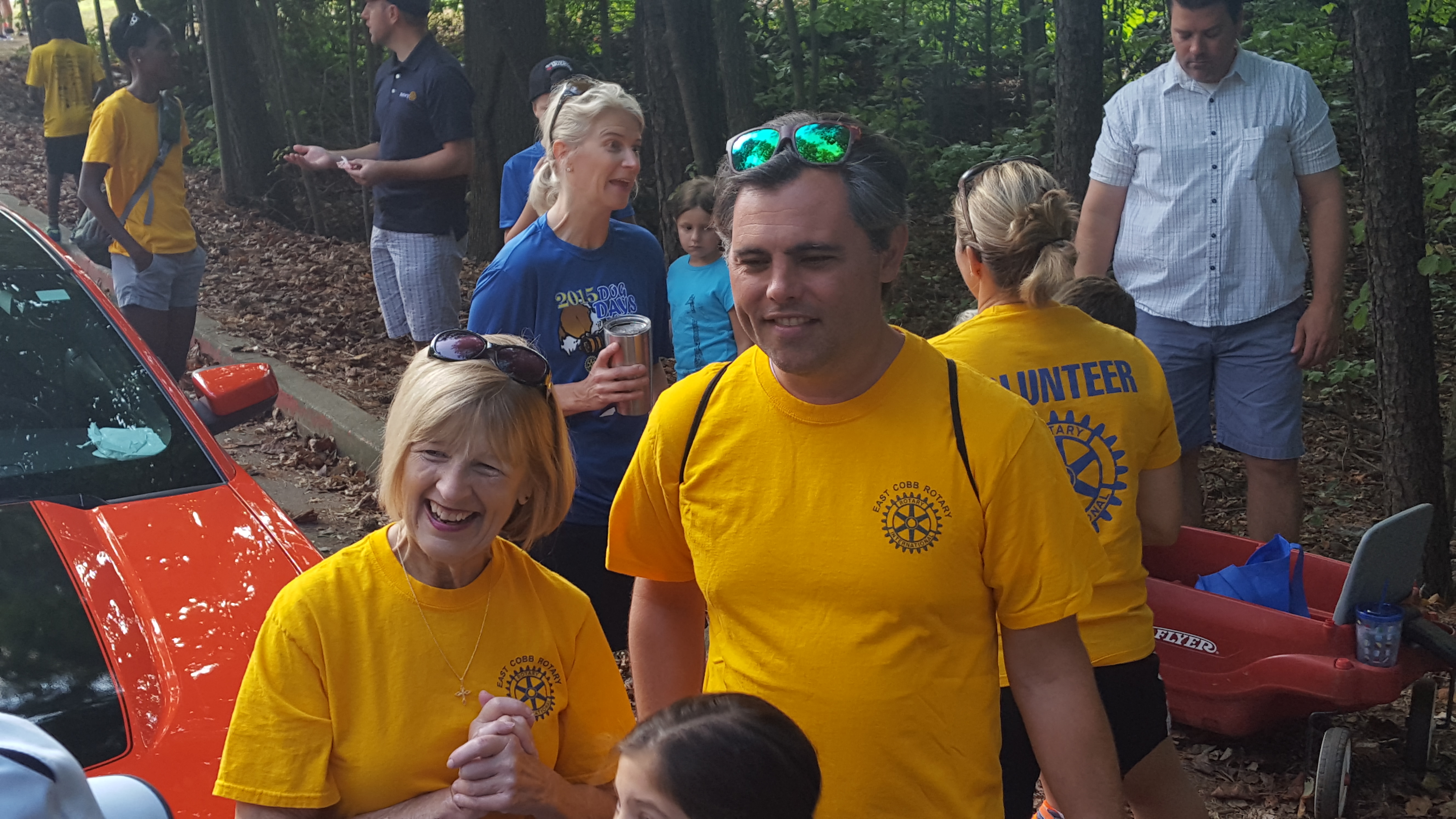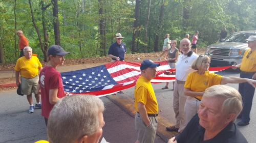 An annual, major and fun East Cobb event routinely added to East Cobb Rotary's calendar of plans is the East Cobber Parade and Festival which serves as one portion of the club's presence, participation, and public relations in the community. Our parade entry includes carrying club banners and a giant USA flag, having cars with Rotary signs, and the tossing of candy to hundreds of kids lining the parade route. Rotarians, their spouses, children, and even sometimes grandchildren, join our parade entry making an impressive sight on the main thoroughfare of Johnson Ferry Road in our East Cobb community. This year's event on Saturday, September 17, 2016 boasted 25 Rotarians and family members as lead organization in the parade carrying a large American flag which drew rounds of applause, salutes and words of gratitude. An estimated crowd of 4,000 attendees witnessed the Rotary Club of East Cobb in fine form.