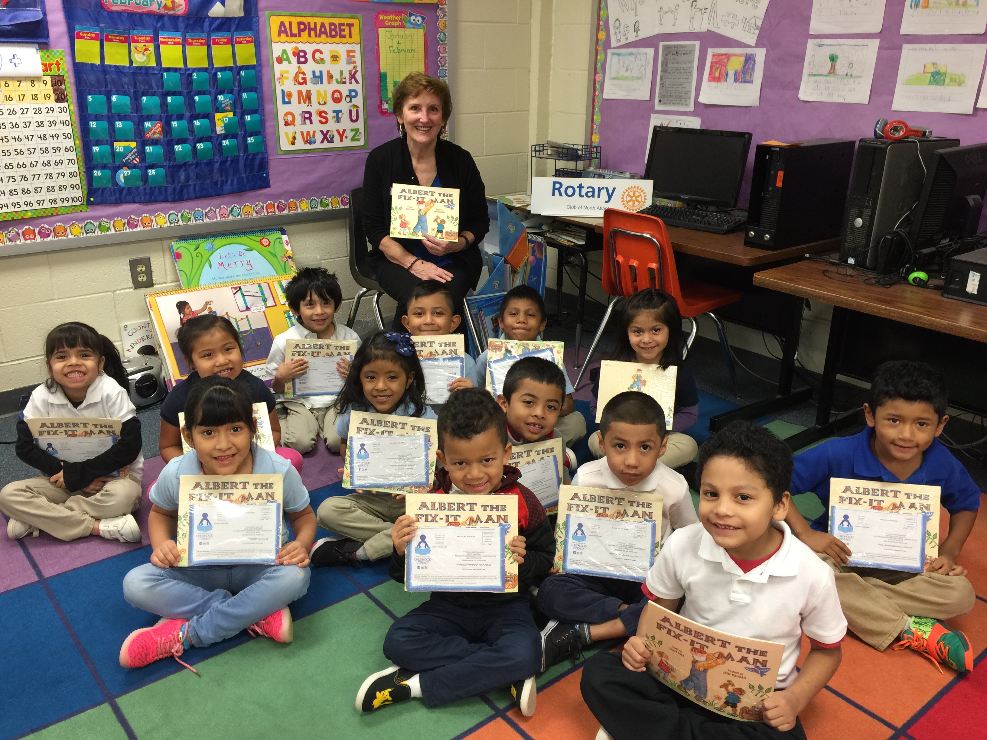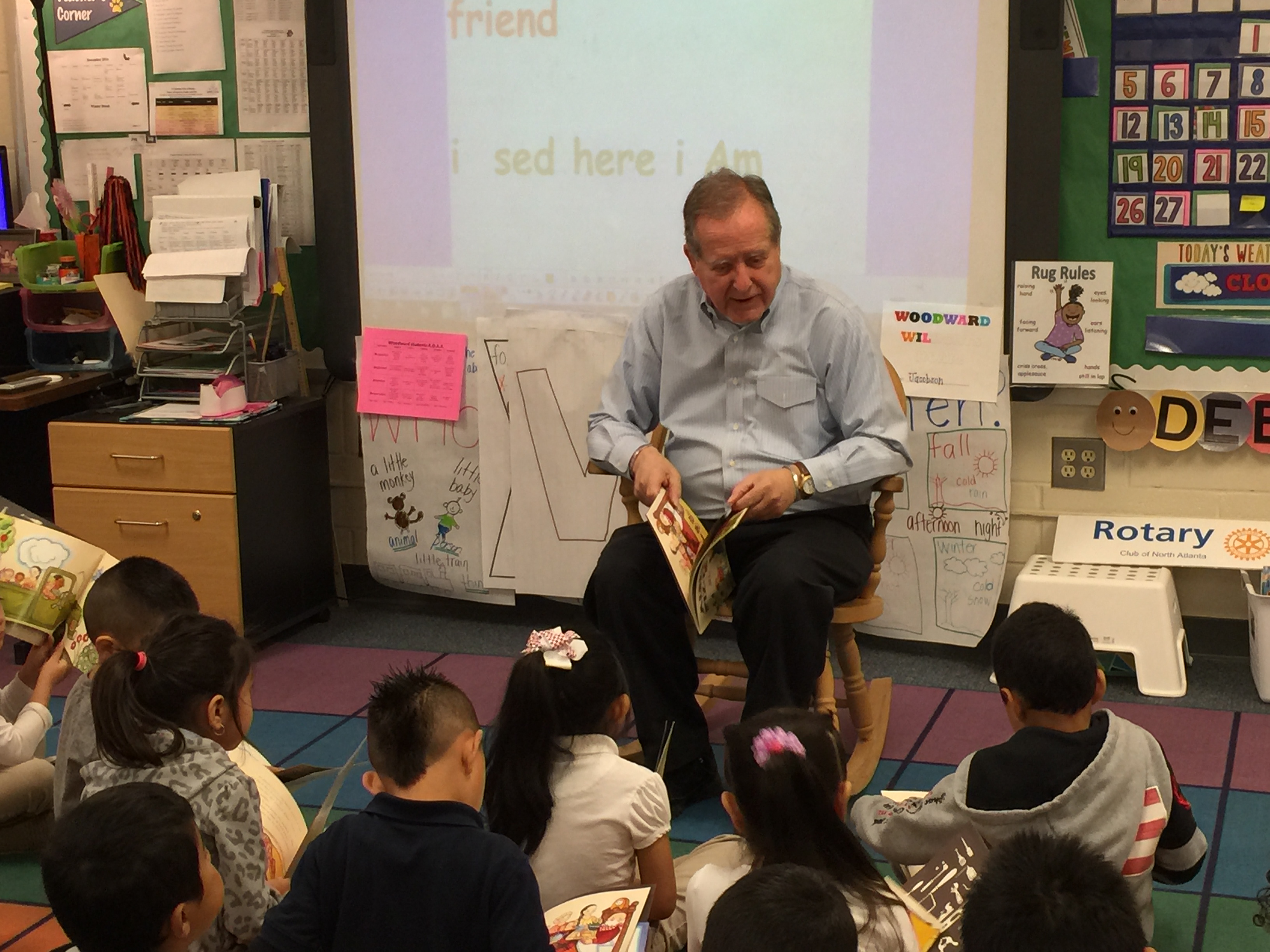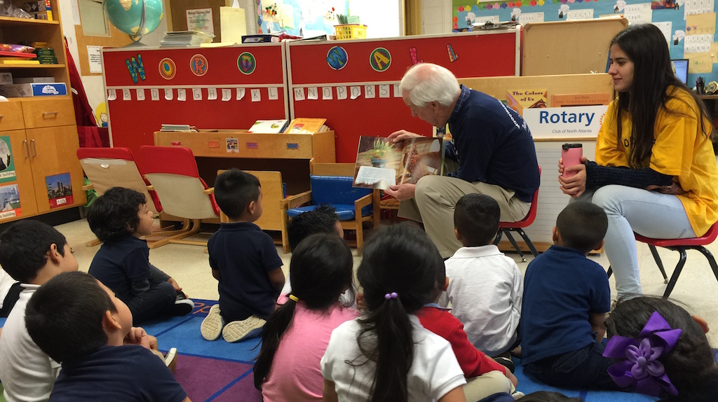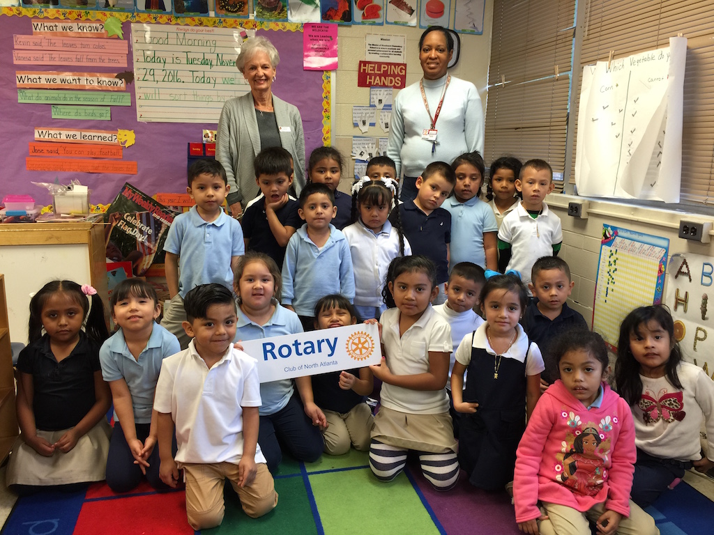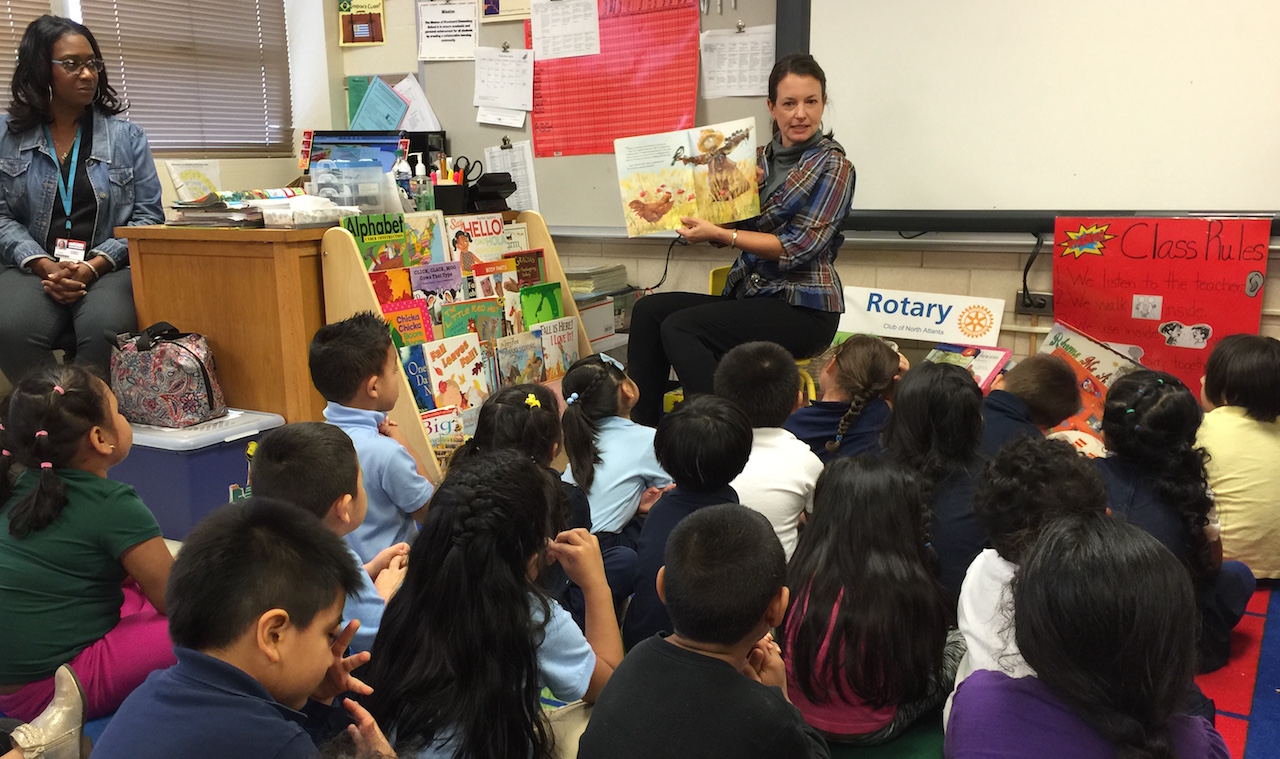 On Tuesday, September 27th we joined Brookhaven (lead), South DeKalb, Dunwoody, and Decatur Rotary Clubs as monthly volunteer classroom readers participating in the Early Reading Program for Pre-K and Kindergarten children at Woodward Elementary School. We are participating in the state-wide literacy effort to provide Language Nutrition, Access, and a Positive Learning Climate for these children, many of whom are from families where English is their second language. We are participating with the Ferst Foundation to provide each child with a new book every month. Volunteer readers read the book in the 13 classrooms and then each child takes a copy of the book home and reads it with their parent(s)/guardian(s). Each family will also receive a parent reading guide provided in English and Spanish.