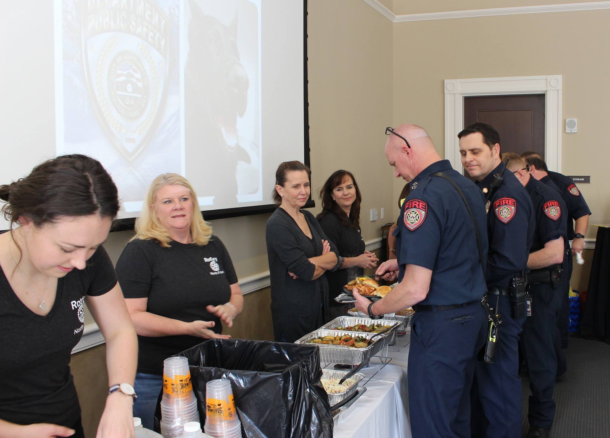 Our first annual First Responders Appreciation Luncheon was a huge success. The luncheon was held in the Multipurpose Room at the Alpharetta City Hall on January 12, 2017. We catered barbecue lunch with all the fixings serving 30+ First Responders from the Alpharetta PD, EMS & Fire stations. We also formally presented K9 Mattis with his ballistic vest that we purchased for him along with a bag of toys. President Natalie is most proud of this event for its outreach and appreciation to public servants as well as our local hero K9 Mattis. P/E Mike intends to continue this as an annual event next year and going forward.