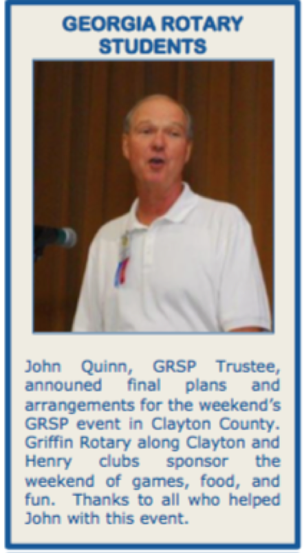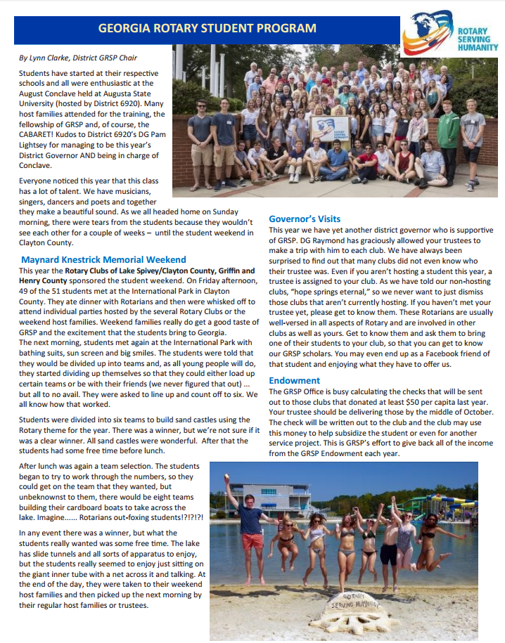 The Rotary Club of Griffin joined with the Rotary Club of Lake Spivey/Clayton County and the Rotary Club of Henry County to sponsor the Maynard Memorial Student Weekend. Griffin Rotarians hosted GRSP students and provided transportation to the event at the Clayton County International Park. The students participated in team sand castle building and cardboard boat competitions. Rotarian John Quinn and his wife Christine hosted a social Friday night for the students and host families. All Rotarians involved had a great experience getting to know these wonderful students!