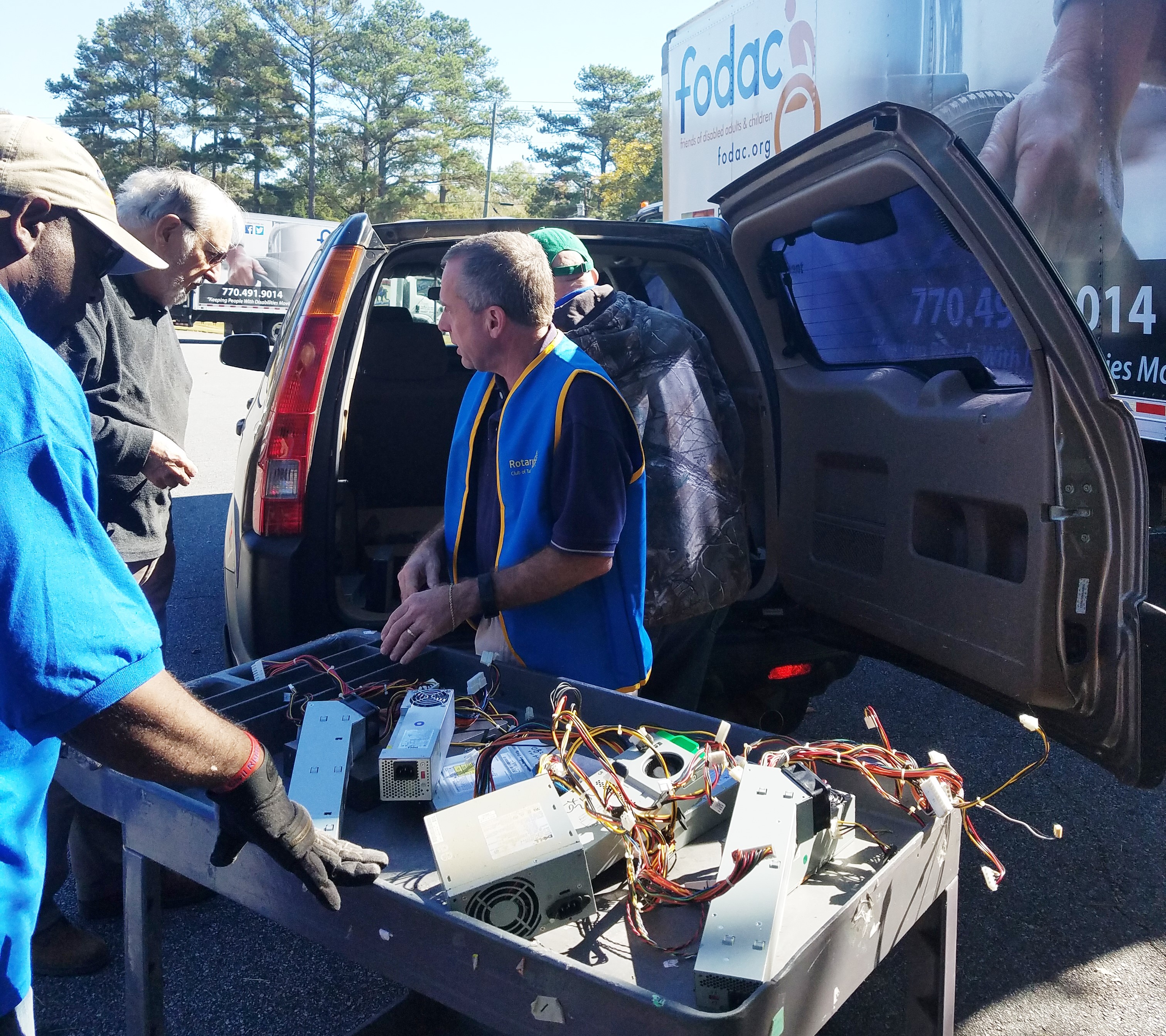 The first Saturday of November provided a bright and sunny day for the 3rd Annual Electronic Recycling Day sponsored by the Rotary Clubs of Tucker and Stone Mountain. All items collected went to FODAC located in Tucker. A steady stream of traffic kept the club members busy greeting people, explaining about FODAC, seeking donations for FODAC and unloading the vehicles.