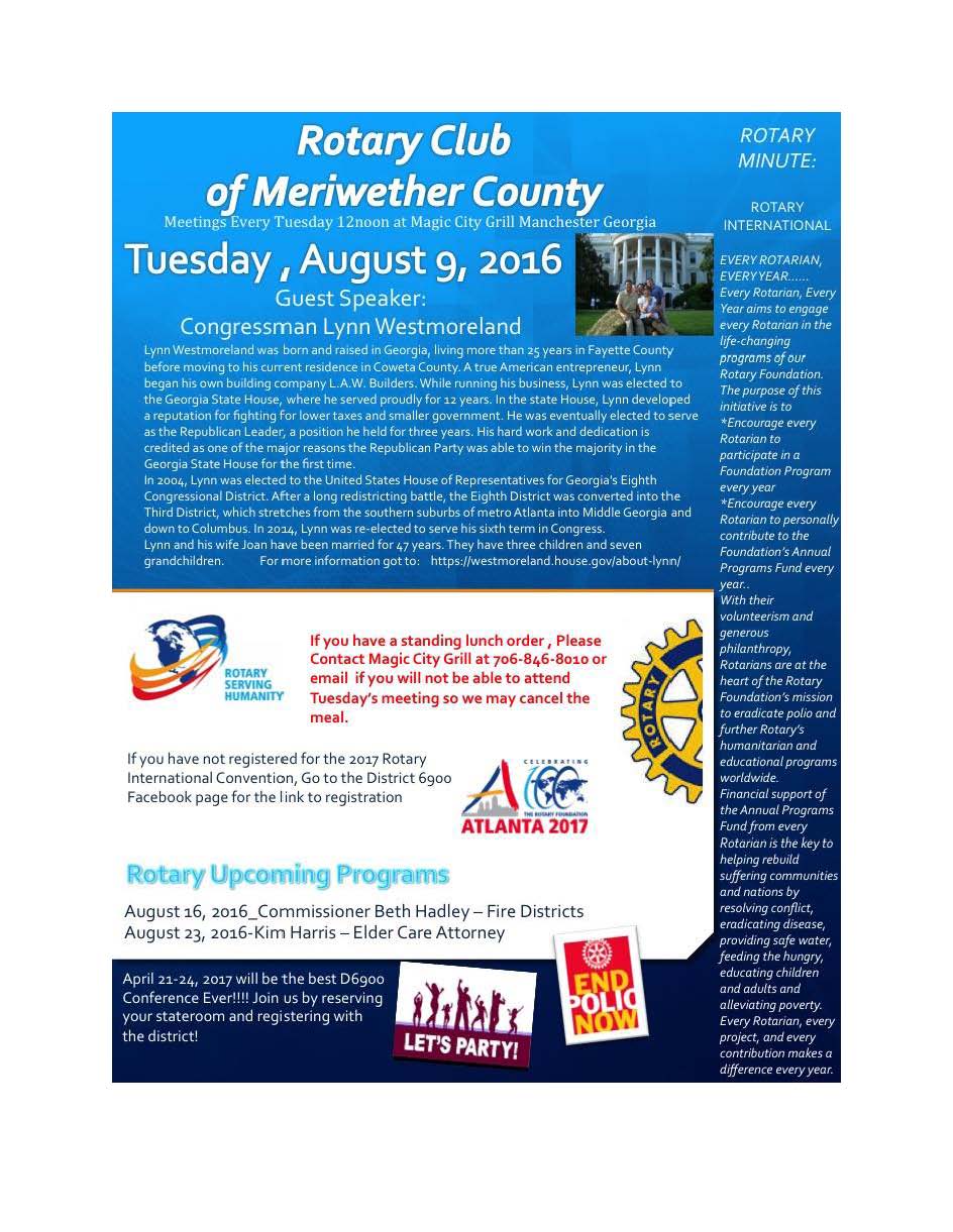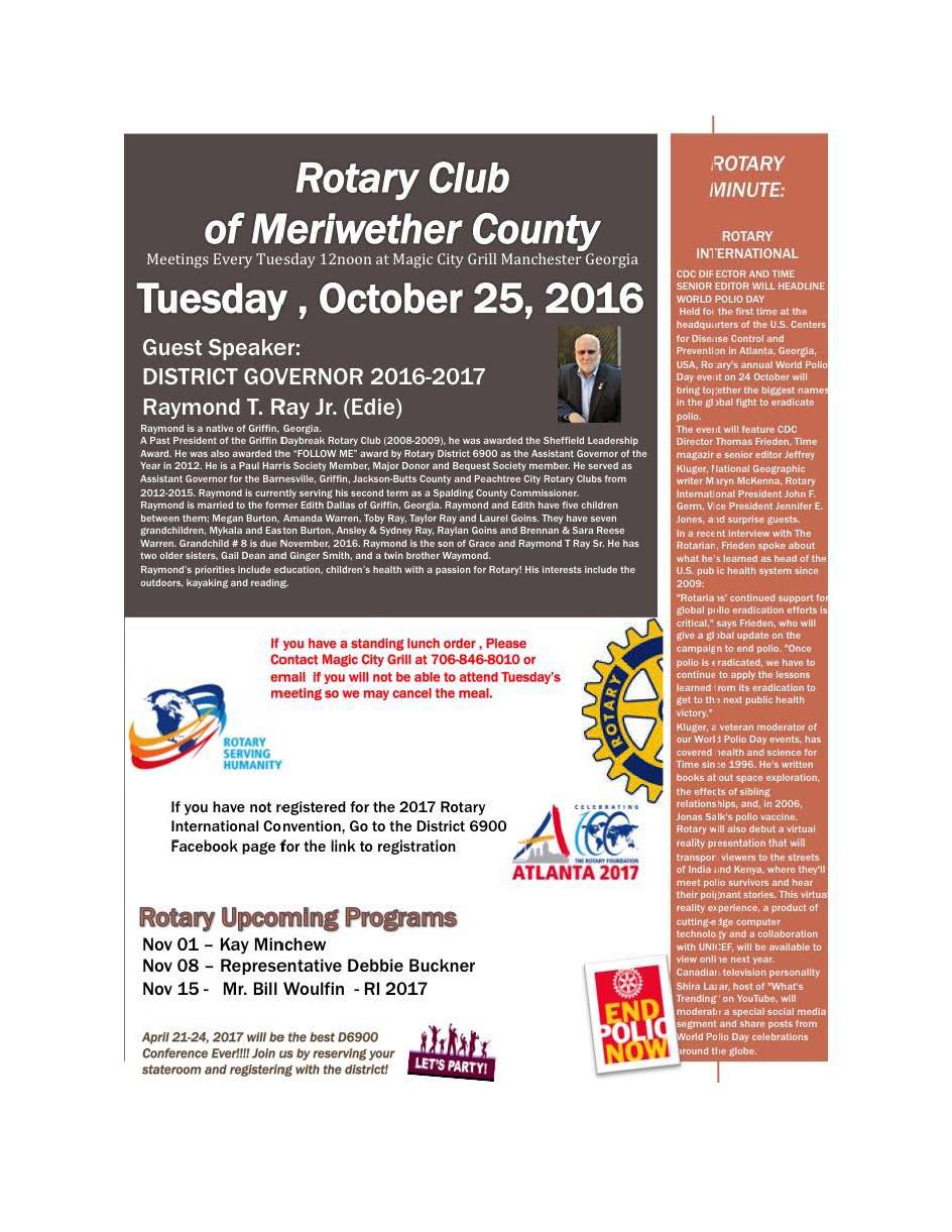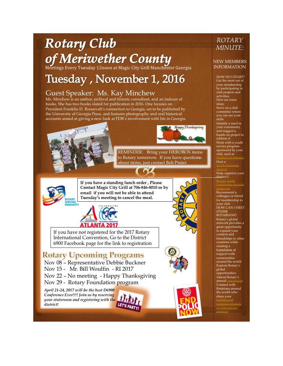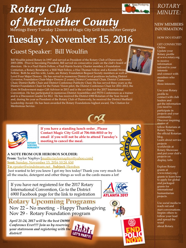 The Meriwether County Rotary Club provides a weekly Club Bulletin for the members of the Rotary Club of Meriwether County. Each week the Club Bulletin is emailed to the club members to view on various items for the club to view. These include: Speaker info, Upcoming Calendar info, A Rotary Minute, and Rotary International information.