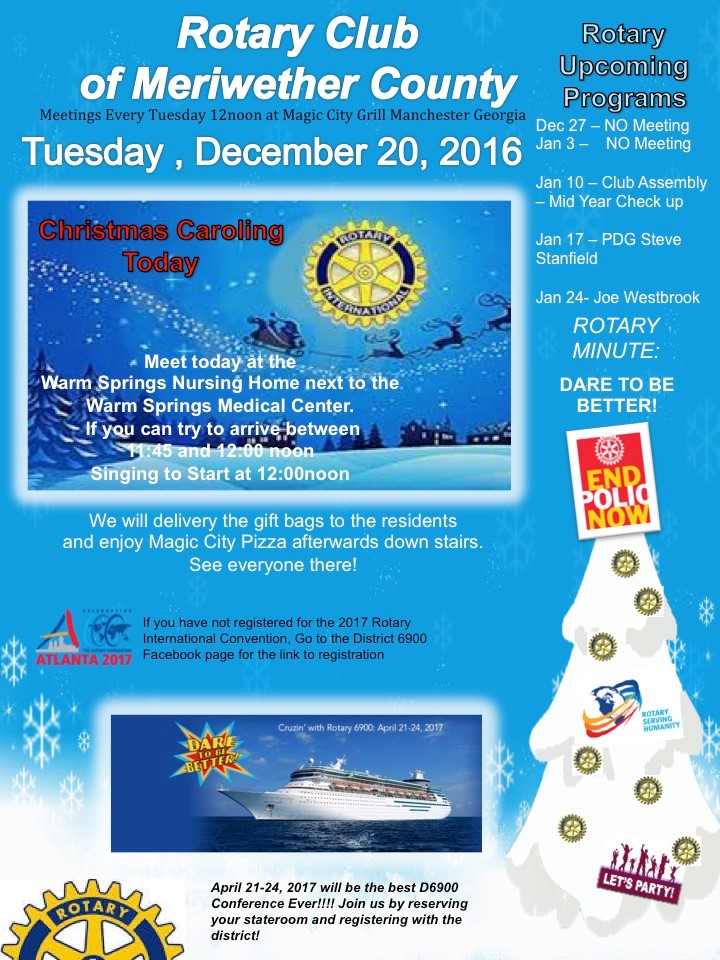 Club Bulletin-Christmas Caroling at the Warm Springs Nursing Home and Christmas Gift Giving for December 20 2016
