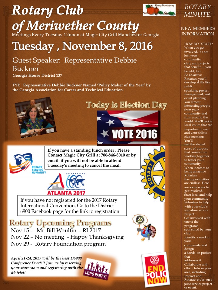 Club Bulletin Ga House Representative Debbie Buckner form District 137 Nov 8 2016