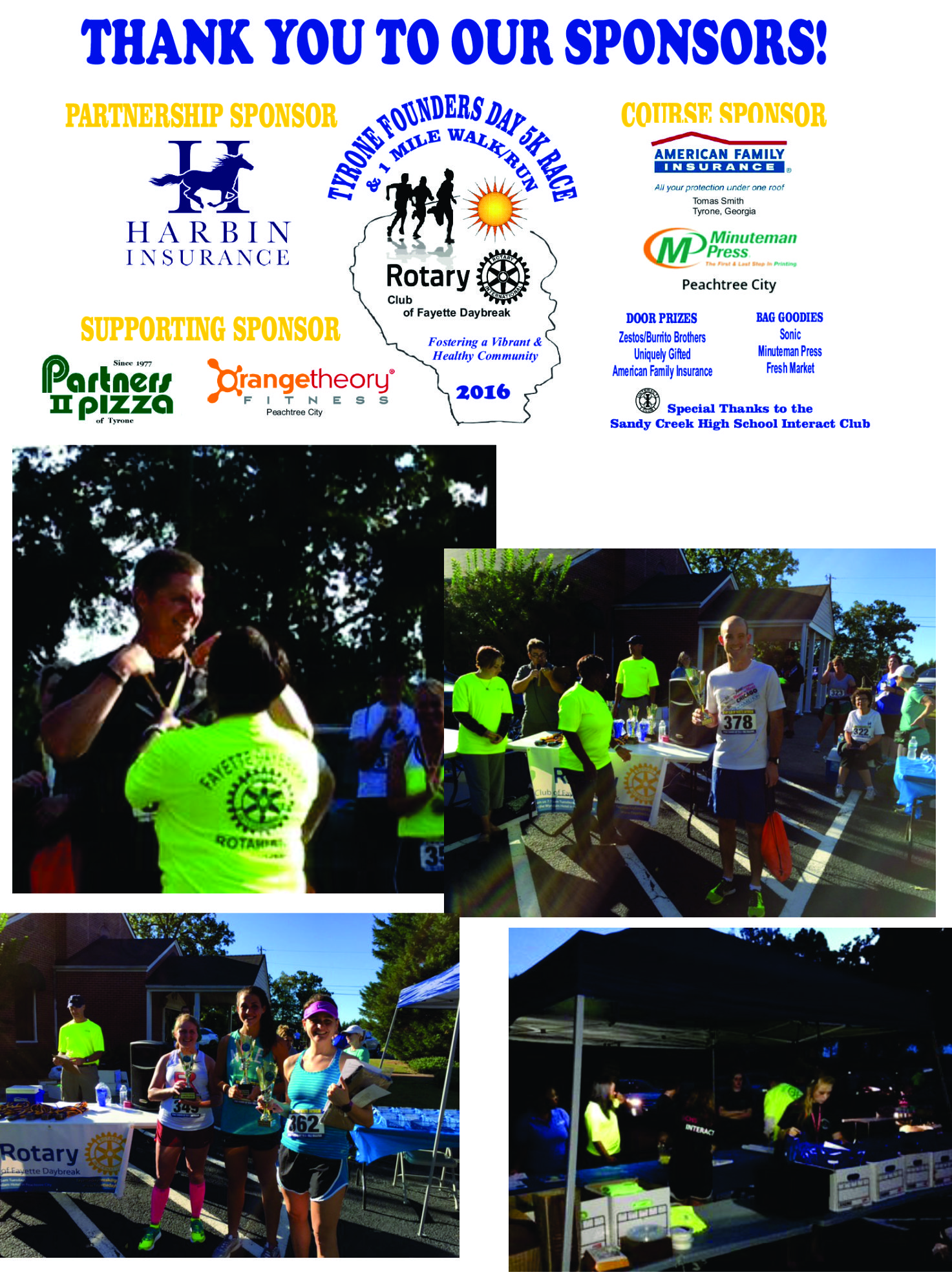 This is a signature event for our club to raise money for our service projects. This event is part of the Tyrone Founder's Day activities. There were almost 100 runners/walkers in the race. We get local businesses to sponsor the race and donate raffle prizes. The top runners in age categories receive medals and bragging rights. 100% of our club is all hands for this event in addition, the Interact club and other family and friends help to make this event successful. We raised $1200 to support 6 upcoming service projects that could potentially reach 1,000+ people.