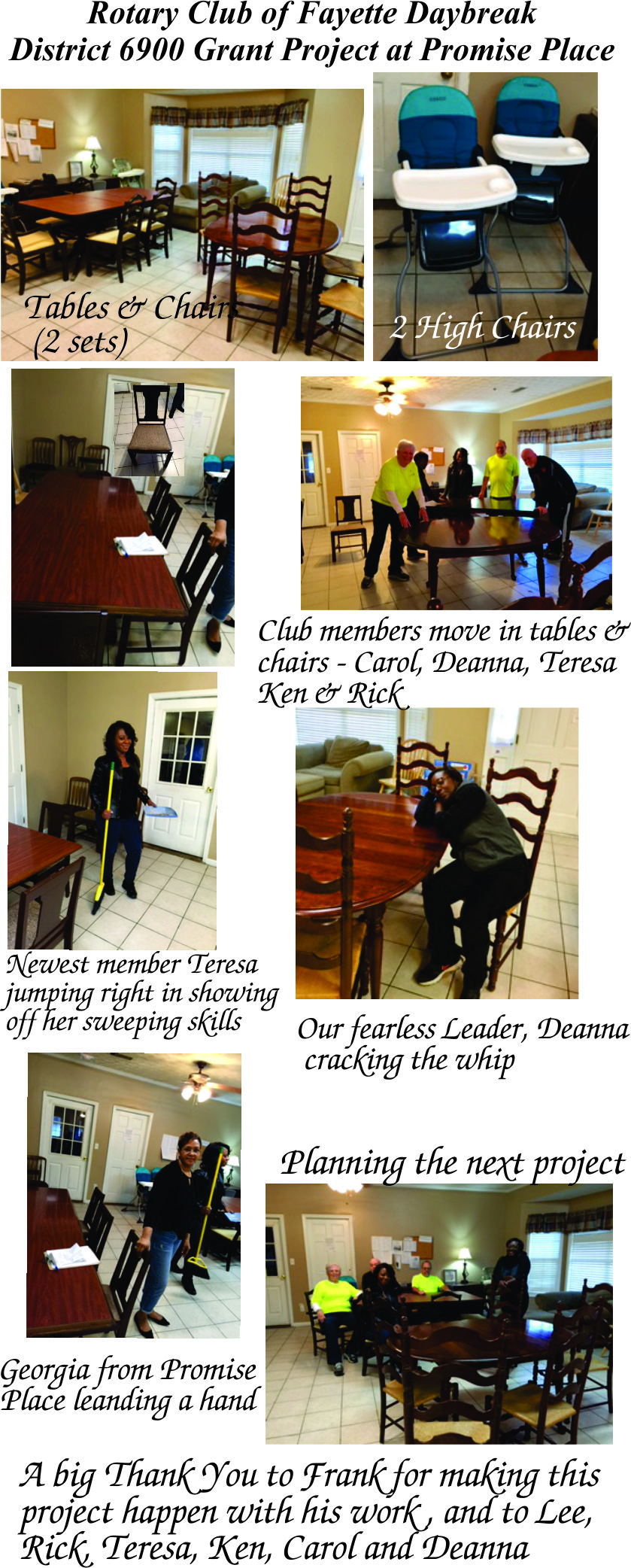 In addition, our district grant will support Promise Place which serves as a women and children of domestic violence by providing emergency shelter, crisis hotline, and support groups to name a few. We purchased $600 in tables and seating for 17 clients and 2 high chairs for their dining room area and mulch for outside landscaping. In total we had 70% of our members who assisted with looking for furniture, delivering, refurbishing, cleaning and putting furniture together.