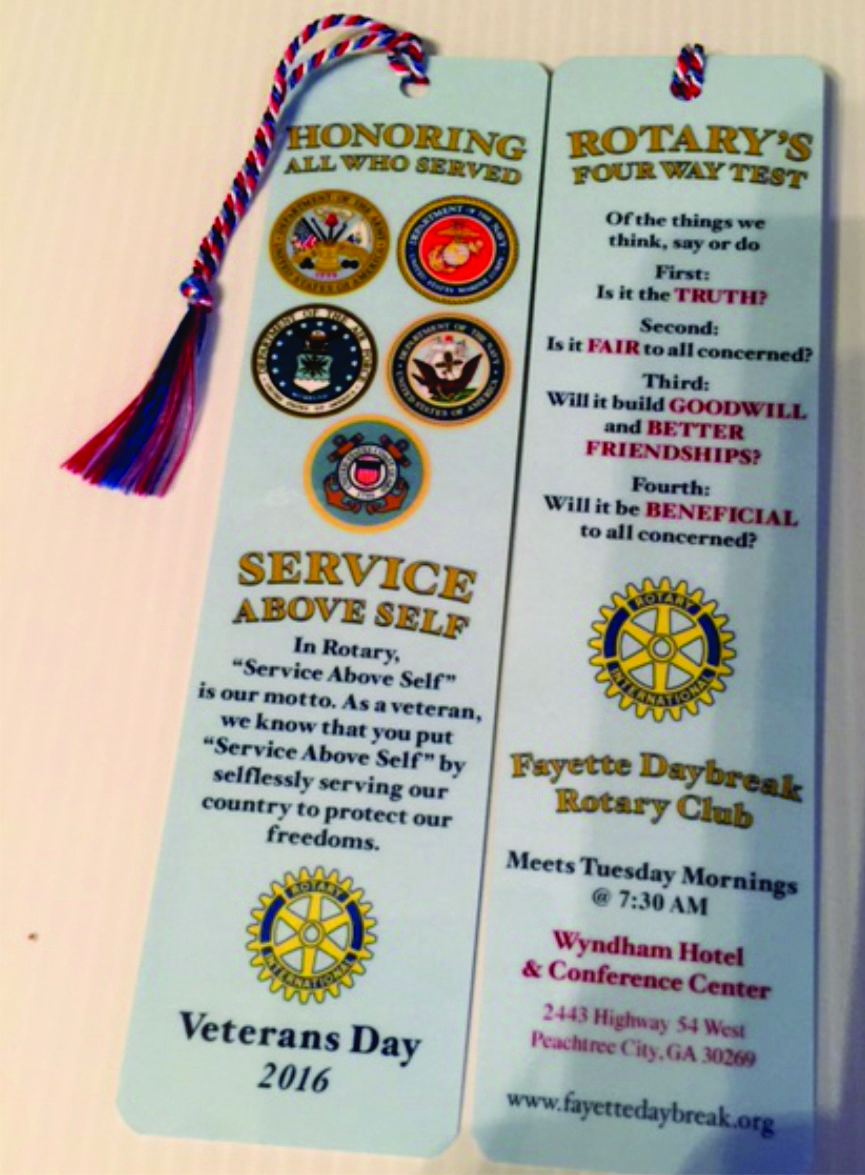 On November 11th, our clubserved coffee, water, pastries and onversation for the Veteran's Day Appreciation for the Town of Tyrone event. In addition, we distributed bookmarks to all of the veteran's that day that were donated to us by Minutemen Press of Peachtree City. Five members of our club served veteran's and attendees on that day. 400+ bookmarks have been distributed and there are still a few left in the Tyrone Library