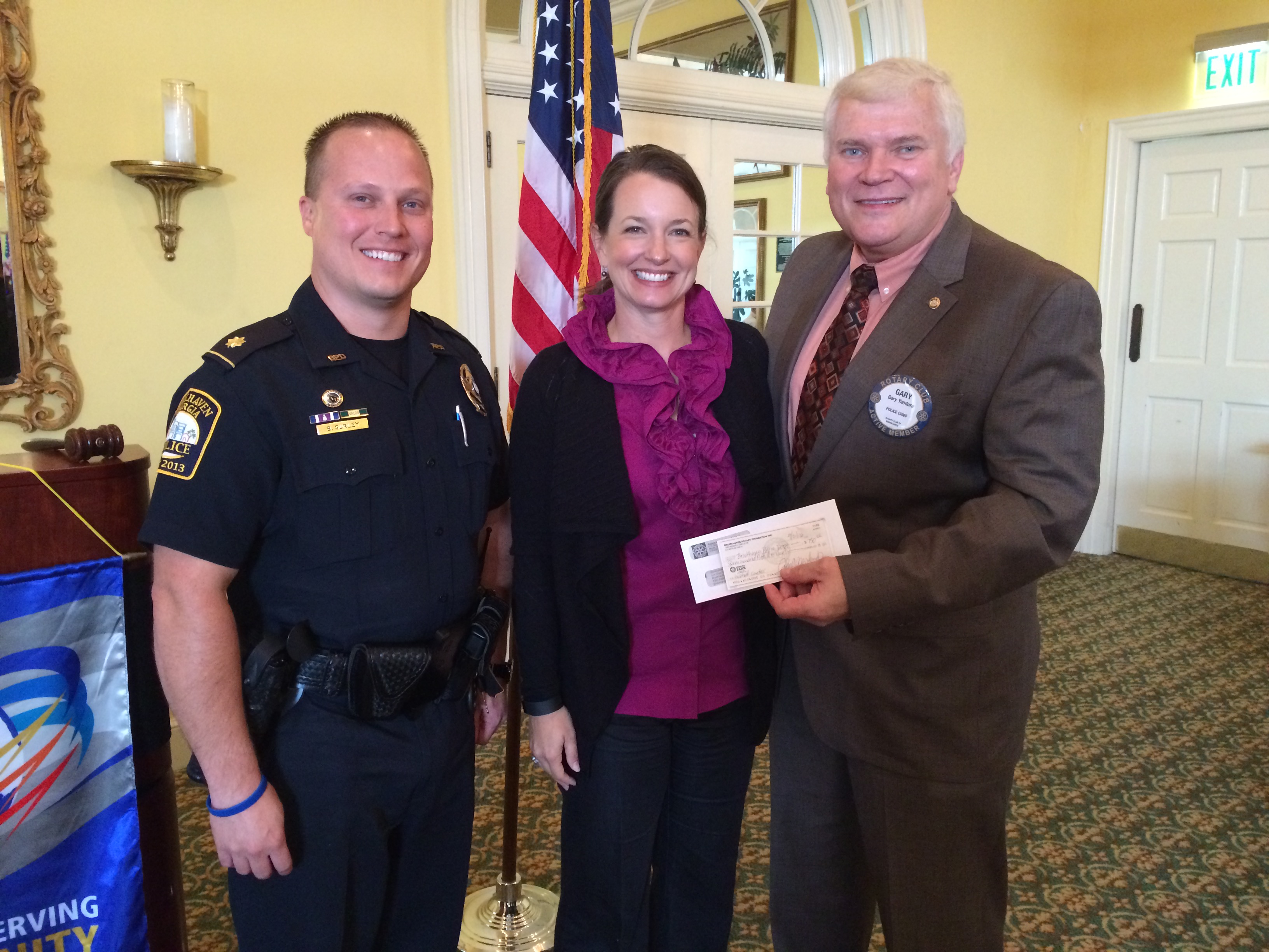 President Bonnie Hardage presents a check to Officer Gurley and Chief Yandura