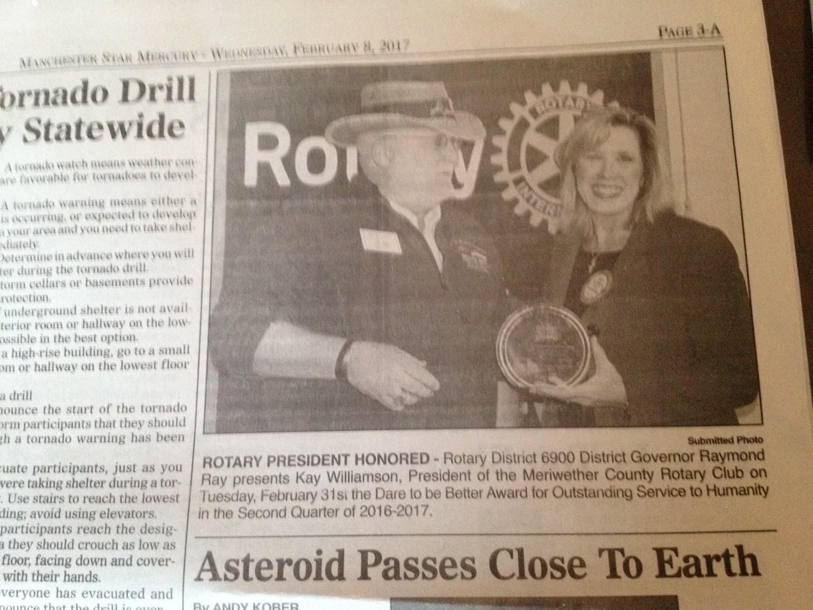 Rotary District 6900 District Governor Raymond Ray presents Kay Williamson, President of the Meriwether County Rotary Club on Tuesday, February 31st the Dare to be Better Award for Outstanding Service to Humanity in the Second Quart of 2016-2017.