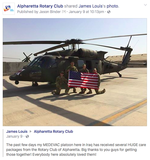 The past few days my MEDEVAC platoon here in Iraq has received several HUGE care packages from the Rotary Club of Alpharetta. Big thanks to you guys for getting those together! Everybody here absolutely loved them!
