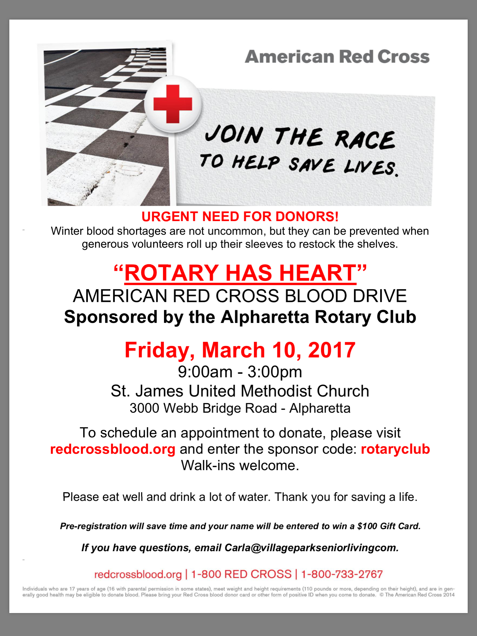 Alpharetta Rotary is organizing a Blood Donation drive on March 10th as part of the Rotary has Heart for the Quarter. We will have 40 volunteers donating which would potentitially help 40 people in the need of blood transfusions.