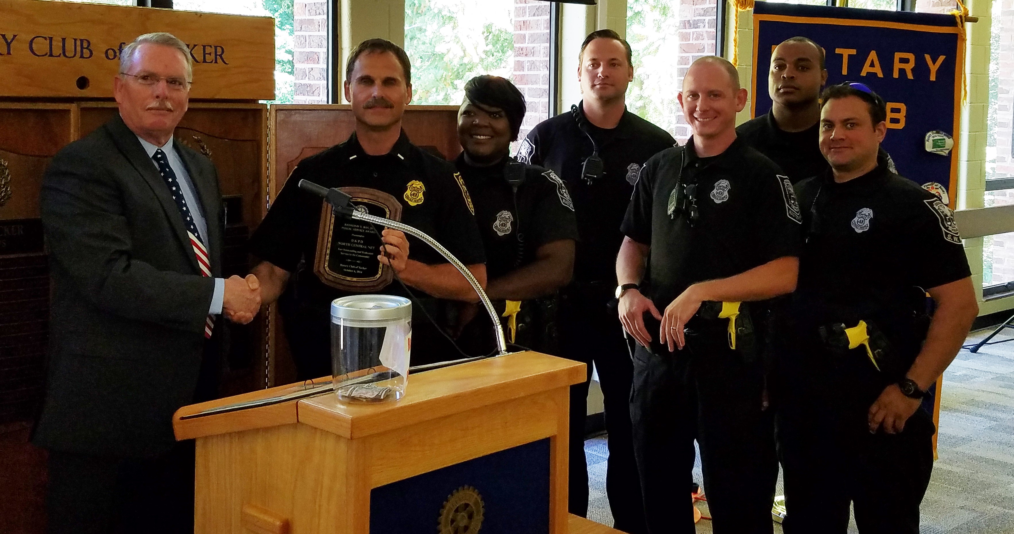 The police unit (who received the RAYMOND T. RAY Jr. public service award) was the Neighborhood Enforcement Team(NET). The team consists of 7 officers(men and women). Often these officers are undercover in high crime areas to help enhance the quality of life of residents. In 2016, NET was responsible for arresting 457 offenders ranging from misdeamors to murder. The Rotary Club of Tucker Thanks thes brave team members for their public service.