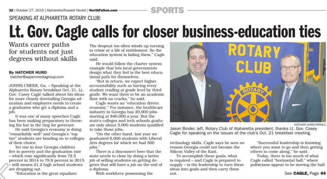 Lt. Gov. Casey Cagle talked about his ideas for more closely dovetailing Georgia education and employers needs to create a graduates who get a diploma and a job.