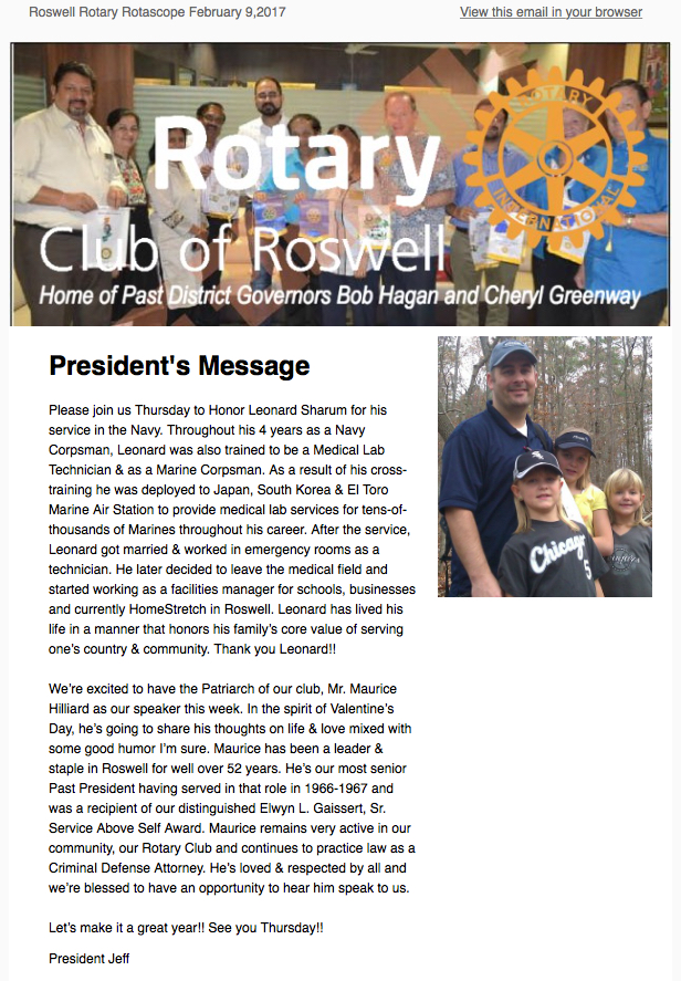 While one member, Joe Piontek, is the point person. It takes several members to gather information about the next week's speaker, upcoming events and announcements to keep members engaged.