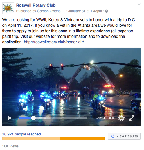 We have a small group of admins for our club's Facebook page but they keep us very active. We generally make post 2-3 times a week with updates from meetings, announcements of upcoming events and showing off our good works. On average our posts are seen by 5-600 people which means they reach far beyond our membership. Our best posts are associated with featured projects like our Honor Air trip. That post was seen by 84,000 people because local media, radio and TV stations shared the post with their audiences. We gave that same post a boost this year to help us find veterans for our next trip. The boosted post was seen by 18,000 people and are next flight is now full. Our audience continues to grow. With over 1,100 fans, our social media exposure is well beyond the membership of our club.