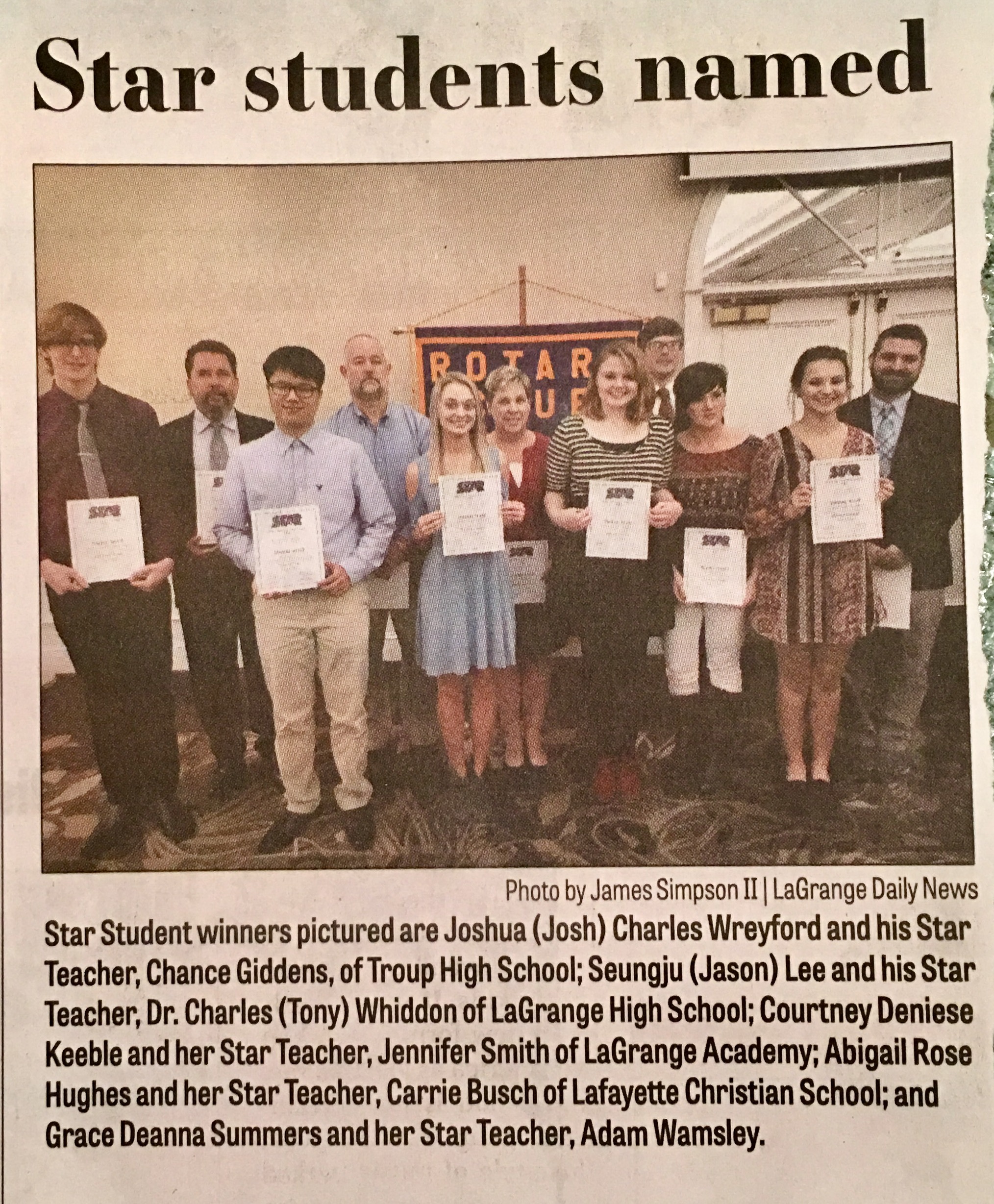 The countywide student winner in this year's LaGrange Rotary STAR program is Seungu Cho Lee. Lee is from LaGrange High School and his STAR teacher is Dr. Charles Whiddon. Lee said Dr. Whiddon had challenged him in his AP Physics class like he never had been before. Lee sited Whiddon for helping him decide what career path he wants to pursue.
