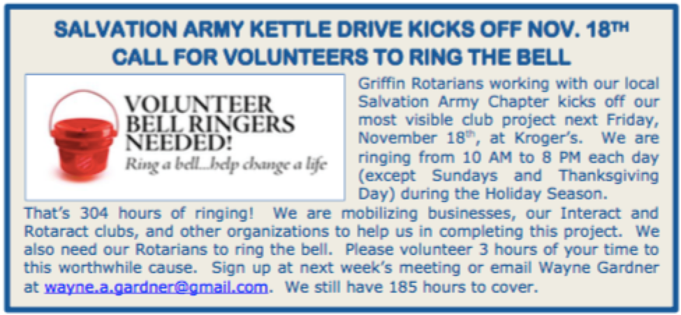 The Rotary Club of Griffin annually supports the Salvation Army by donating money and time to the Kettle Drive and the local Distribution Center. Rotarians, Interactors, family and friends staffed the kettle at the Griffin Kroger from November 18, 2016 through December 24, 2016. Salvation Army committee chairs George Granade and Wayne Gardner solicited volunteers from club and community to ring the bell.