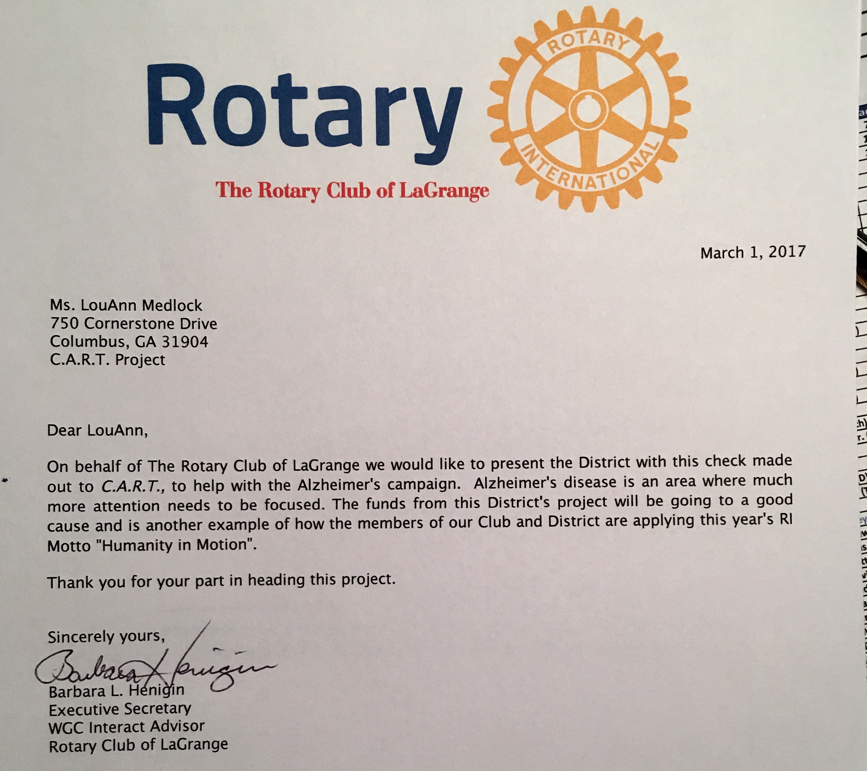 This is our fifth year that we have participated in District 6900's Coins for Alzheimer's Research Trust (CART) project.