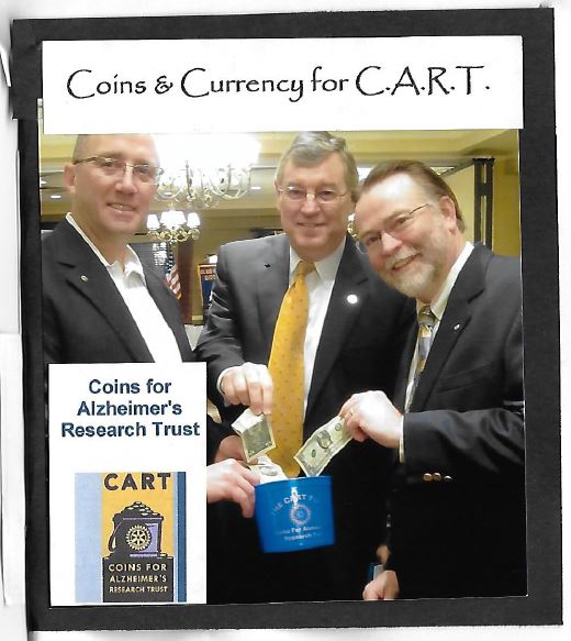 C.A.R.T. Chairman, Steve Snipes, makes sure a blue C.A.R.T. bucket is placed on every table at each weekly meeting so every member is presented the opportunity to contribute. If Steve is absent, he makes sure another club member puts out those C.A.R.T. buckets. Most members contribute during the year, though an exact number isn't known. Verbal reminders cue members to put their coins in the buckets, and dollars are OK too. Several members have formed the weekly habit of emptying change from their pockets or purses and placing it in the bucket which cues others at the table to do the same. Additional funds are extracted from members when the Sergeant-at-Arms asks during Sunshine time for any who forgot to wear their Rotary pin that day to place a dollar in the C.A.R.T. bucket. It's amazing how those extra dollars appear even from Rotarians who are wearing their pin. For several East Cobb Rotarians this humanitarian need is personal and close to home because of experience with family members having Alzheimers. It's a pleasure and privilege for East Cobb Rotarians to support this research cause and its impact on thousands across our nation. As of this report, our club's C.A.R.T. contribution totals $530.50. Past history would predict we're on track to contribute at or above our previous high of $618.00 by this year's end date of June 30, 2017.