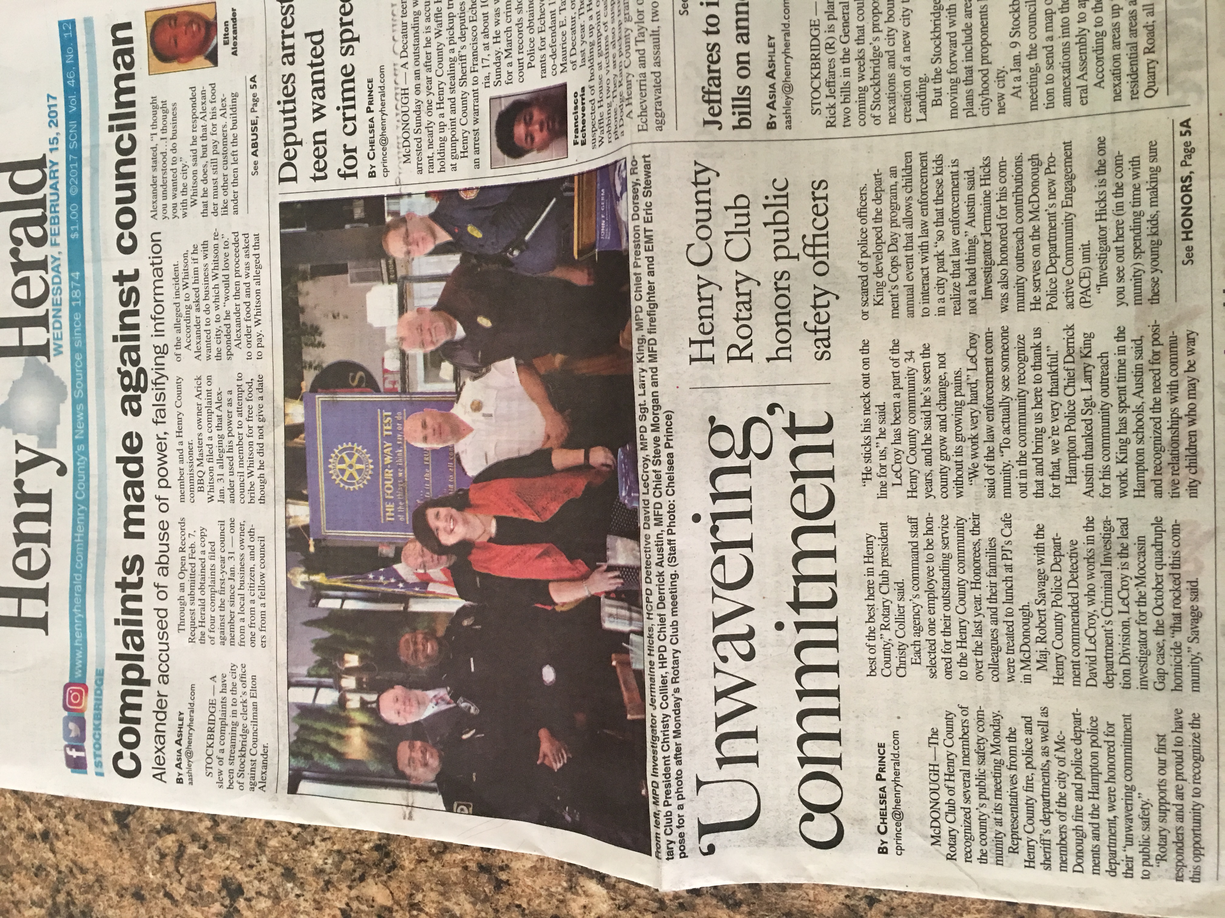 The Rotary Club of Henry County recognized several members of the county’s public safety community at its meeting Monday, February 13, 2017.