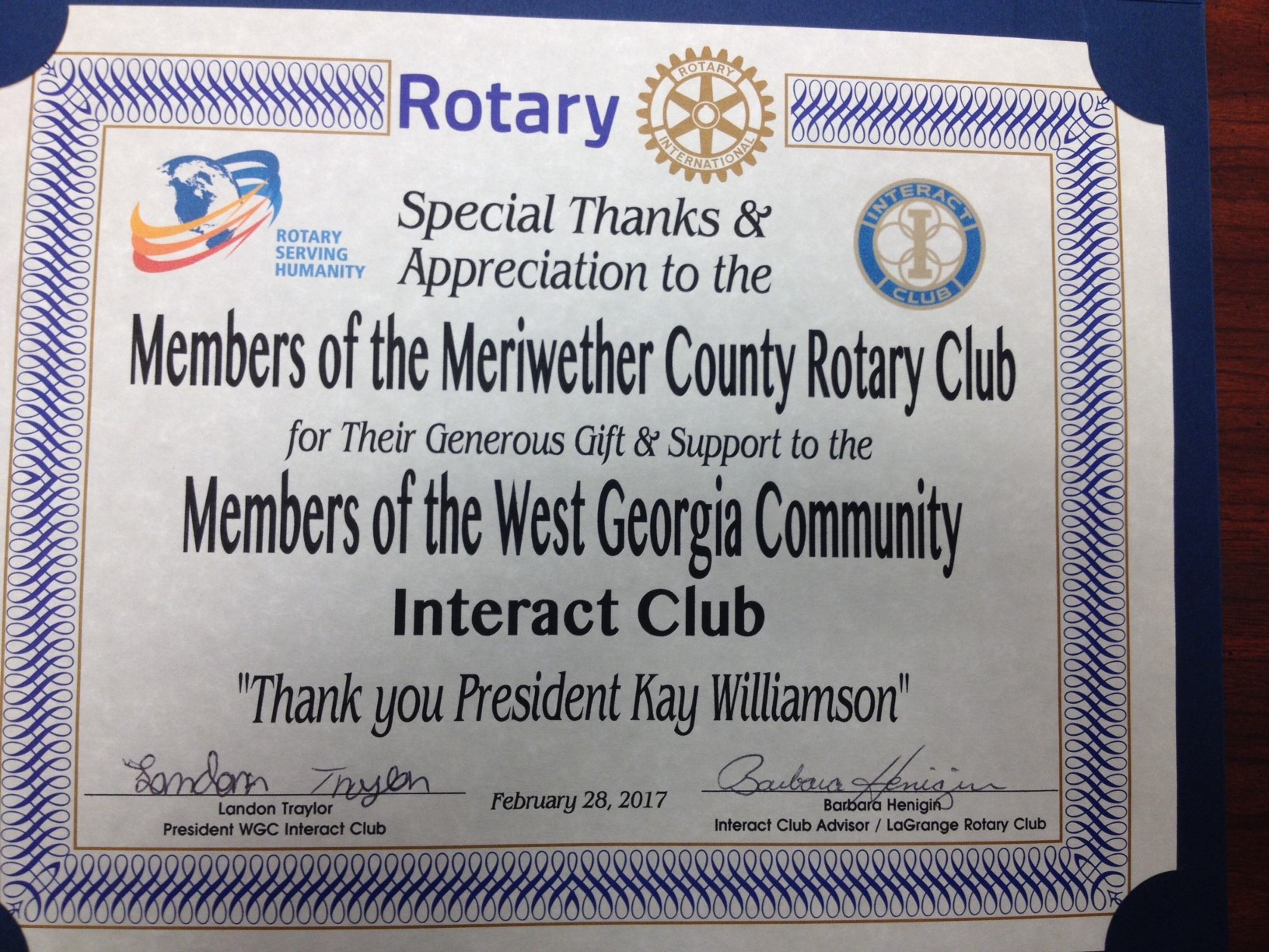 The West Georgia Community Interact Club presented the members of the Meriwether Co Rotary Club a certificate of Appreciation for their help and support.
