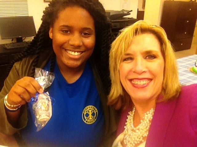 West Ga Community Interact Club member Makala and President Kay Williamson working together at the Interact Club to make bracelets for the International Conference in Atlanta