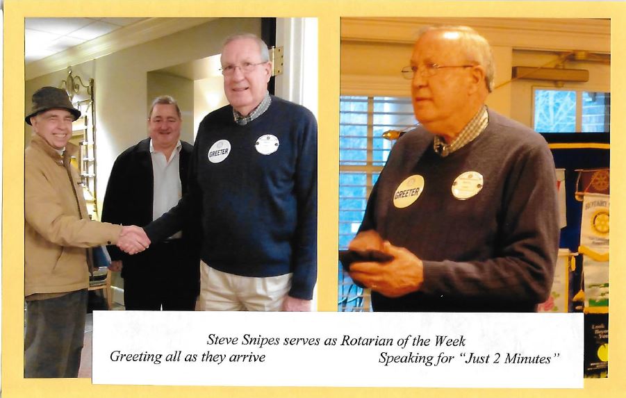 One item on our weekly meeting agenda is called "Just 2 Minutes" where members of the club are scheduled by the Sergeant at Arms to serve as Rotarian of the Week (ROTW) once during the year. The ROTW arrives early to serve as Greeter in welcoming all who attend that day. President Sam calls on the ROTW at the beginning of the meeting to introduce guests and visiting Rotarians, lead the Pledge of Allegiance and ask the blessing for the meal. The Rotarian of the Week then provides a "Just 2 Minutes" presentation about their vocation, educational background, where they have lived, career history, family, special interests, and/or stories from their life. Club members get a glimpse into the life of their fellow Rotarian, and it's a chance to become acquainted with new members as well as further develop relationships among veteran members. Each week's "Just 2 Minutes" is different, and sometimes surprising. Since club membership now totals 68 and meetings are held 50 weeks of the year our club member participation in this Vocational Service project is at seventy-three percent (73%).