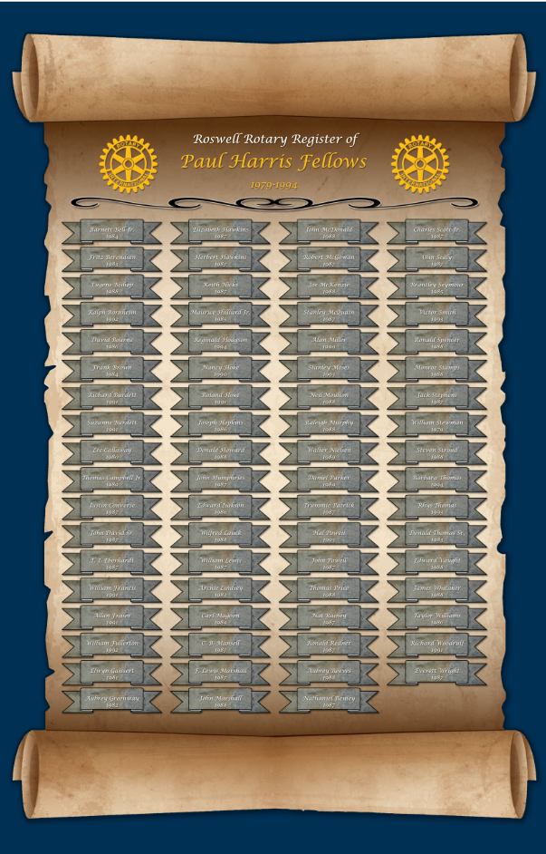 For years, Roswell Rotary has proudly displayed our long registry of Paul Harris Fellows and Will Watt Fellows so that members and guests can be inspired by the patronage of other members.