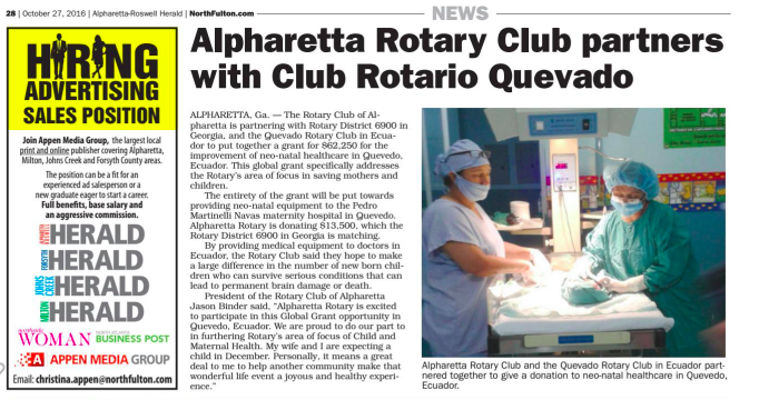 Alpharetta Rotary Partners with Quevedo Rotary Club
