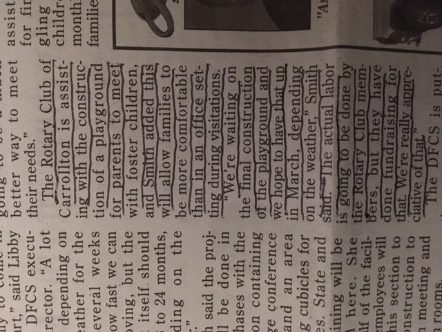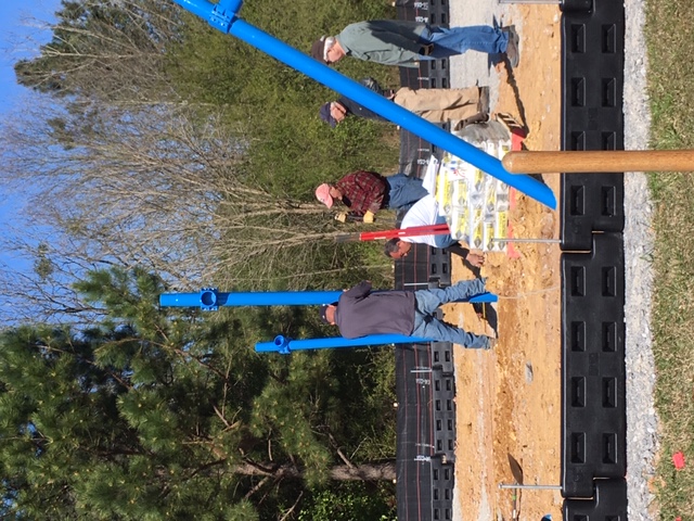 | Dawn Breakers Rotary club made a financial contribution of $500 plus individual members contributing $500. Carroll County Government contributed dirt and rock resources to provide the pad for the playground. The government provided the machinery to move the dirt in order to make the pad. The Government also provided inmate labor to build the pad. It has provided dirt, rock, pipe and heavy machinery to prepare the pad and to provide skidsteer and augurs to drill the holes. The swing set holes required 24 inch augurs to drill the holes. The playground component required 12 inch augurs to drill the holes.. They contributed about $15,000 to the project. Superior International Plastics provided the playground equipment at cost. Kor Kat provided expertise to install the playground and to guide the Rotarians at cost. The company contributed $10,000 to the project by providing the equipment at cost. |