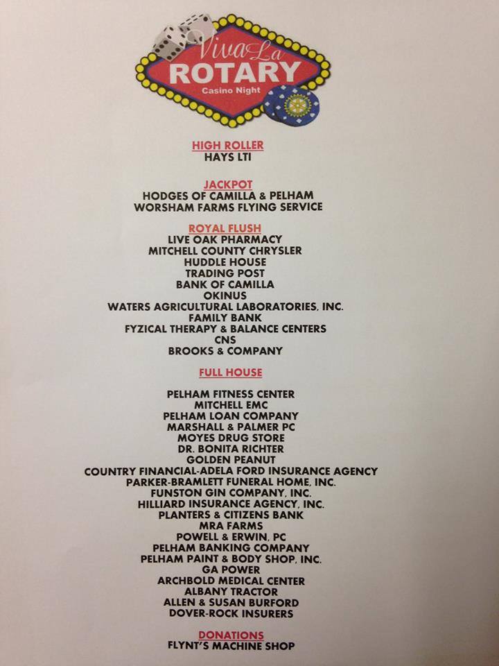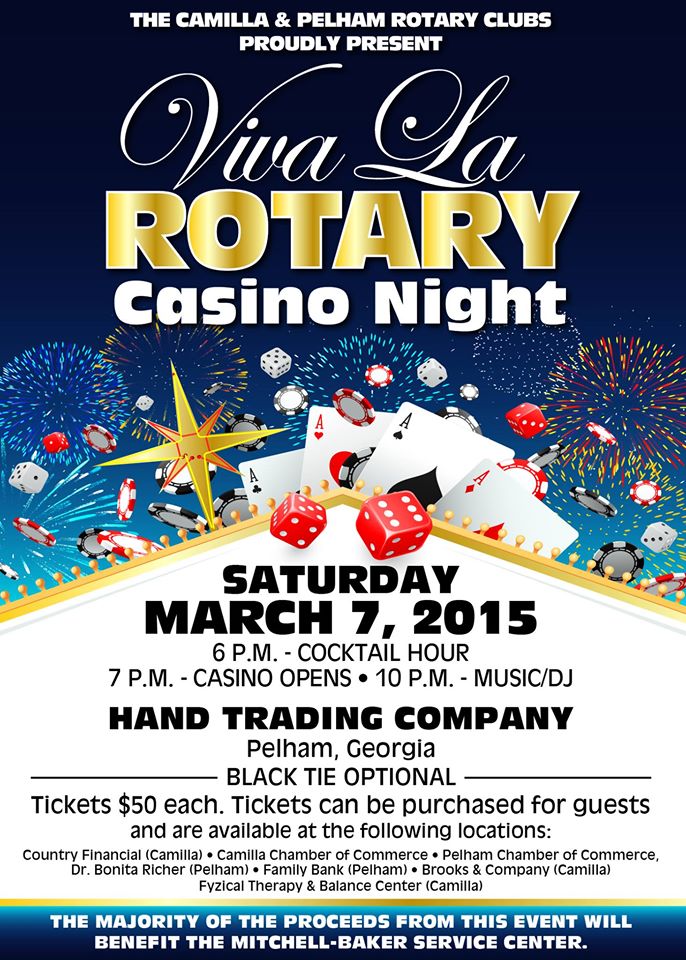 The Viva La Rotary Casino Night is a joint fundraising event for the Rotary Club of Pelham and the Rotary Club of Camilla held annually in the historic Hand Trading Company building in Pelham. Each year members from both clubs meet for several months to make plans and prepare accordingly.