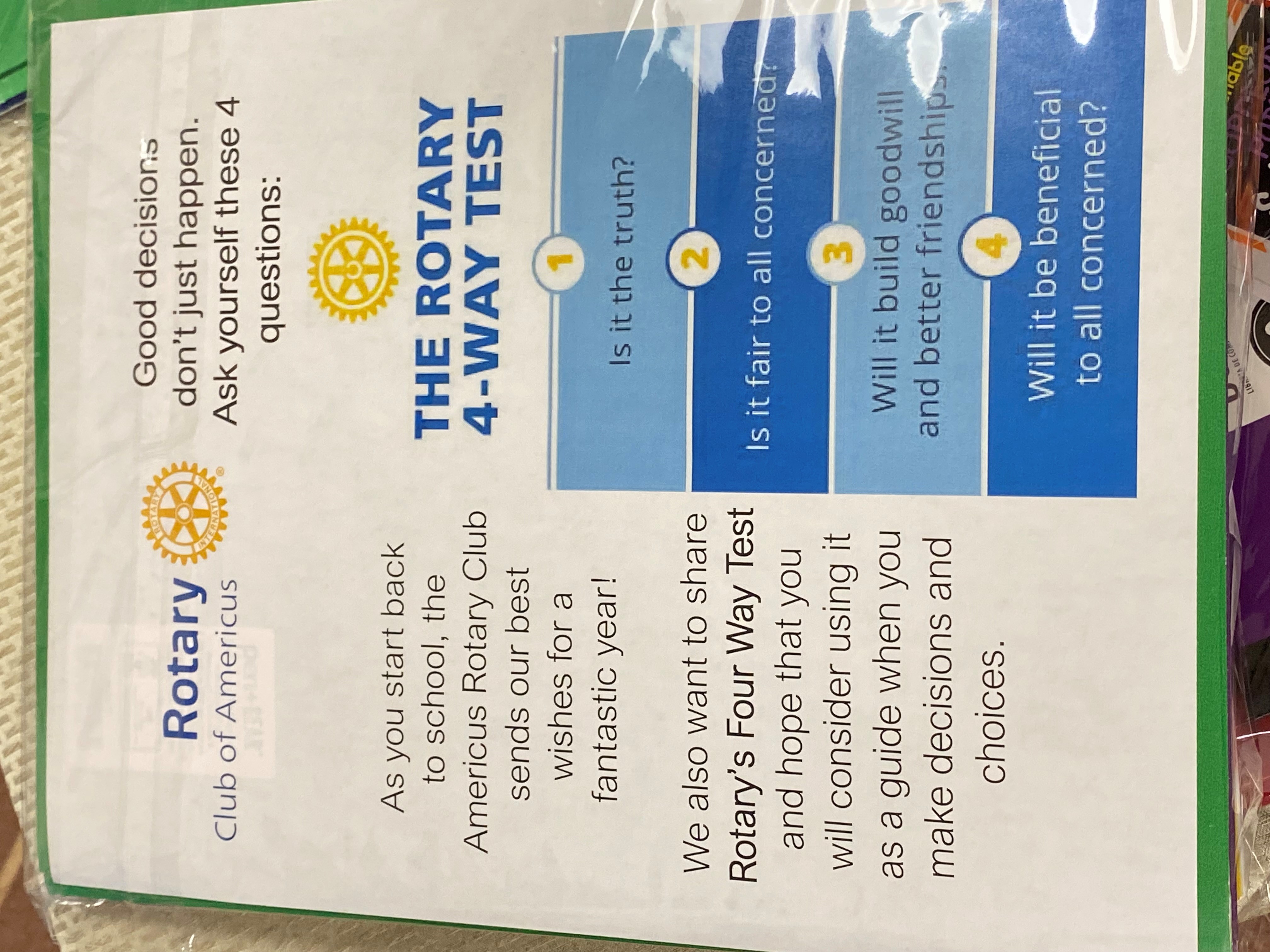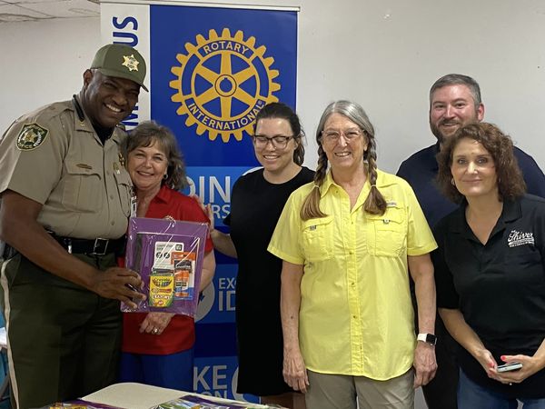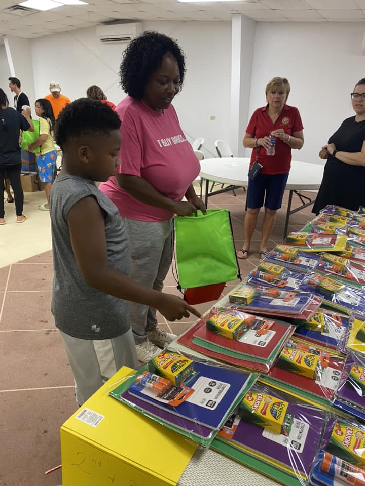 Rotary Club of Americus joined forces with other area organizations, non-profits and churches to give out free school supplies to children in our community. The event was coordinated by the Americus Police Department (APD Chief is a Rotarian) and eliminated duplication of services, ensuring that more children got needed supplies. Americus Rotarians gave out 100 packets to 2nd and 3rd grade students with supplies off of their list which included 3-pronged folders, composition books, 24 pack of crayons and pack of glue sticks. We also included a flyer which talked about the 4-way test. See attached for example.