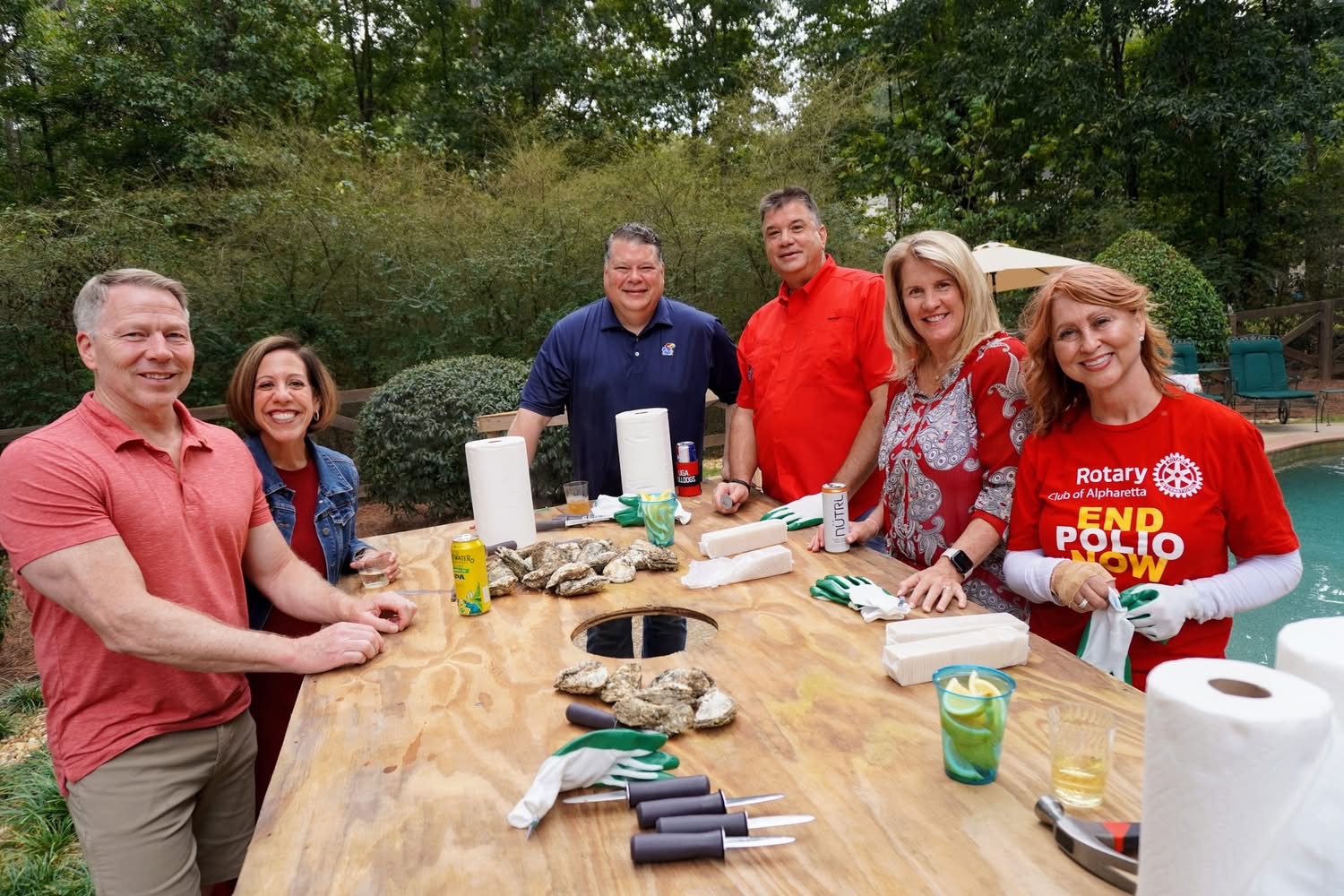 The Alpharetta Rotary Club continued our traditional Oyster Roast Polio Awareness event for the 11th year. This is a major club fellowship/fundraising event and a favorite of our Rotarians. Prior to the event we adopted the Red Alpharetta Rotary apron to help raise awareness for the battle to end Polio around the globe. The apron continues to be available for sale, and the proceeds go to Polio. Members have worn the apron at all the Alpharetta Service Heros Rotary Feeds events at Fire Stations, Police Stations, ARNG Armories and VFW. Another opportunity to raise awareness of our fight against Polio. The Oyster Roast held on October 4th was an enormous success with over 54 Rotarians and Friends coming together for a “Good Day of Shucking for Polio” The event raised $2,476.00. In addition, the Club contributed $10,000.00 and the Polio Polar Bear Plunge Team continued the focus on the fight against Polio and raised over $400.00. We as a Club are committed to seeing Rotary’s number one focus to eradicate Polio is a success.