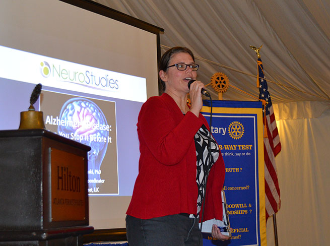 On Monday, October 14, Dr. Laura Szymanski, Research Coordinator at NeuroStudies quizzed the Sandy Springs Rotarians on many questions pertaining to the health of our brains. One question she asked was about risk factors: "Fact or Fiction? - by age 85, people have a nearly 50/50 chance of developing Alzheimer's Disease." She proclaimed the last statement to be a fact and went on to explain their findings through studies and data accumulation. A second quiz question she offered was: "Fact or Fiction? - If a mom had Alzheimer's, that means I am going to get it too." This, she told us, was fiction and again showed data which supported her answer. One of her last questions was this: "Factor or Fiction? - There are health supplements which have been proven to improve memory." That statement is fiction, she says. She noted that there have been absolutely no supplements that have been proven to help improve our memory, but she also stipulates there are perhaps substances that do work, but no one has been actually able to prove it.